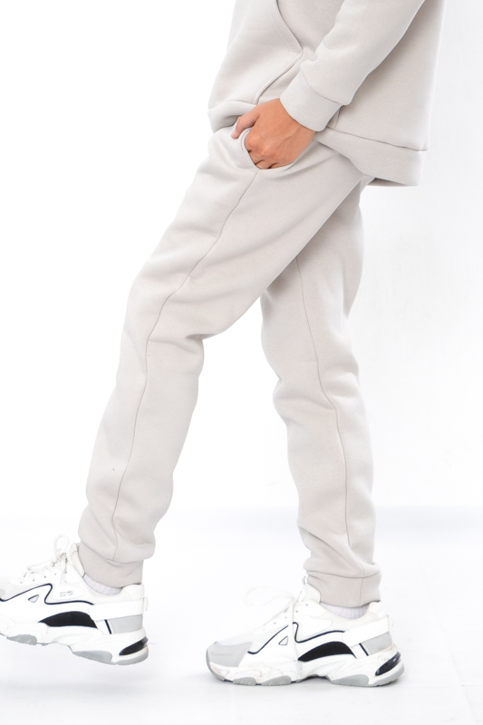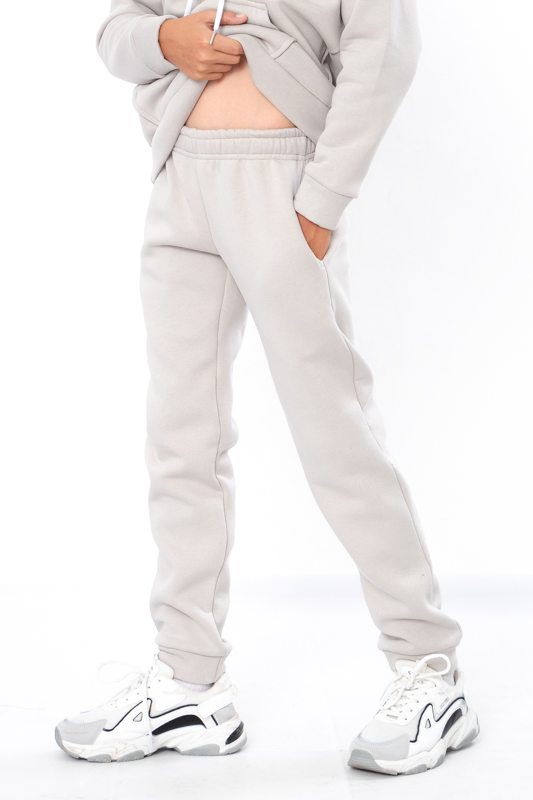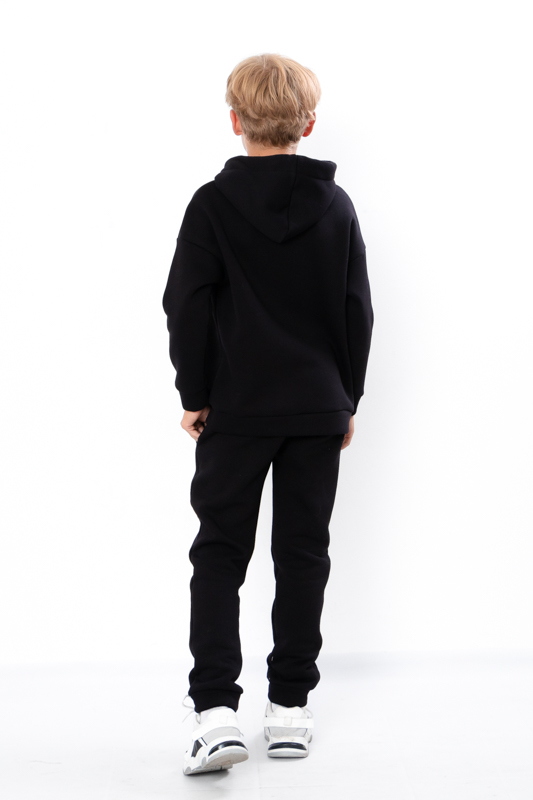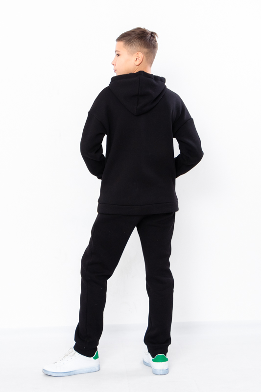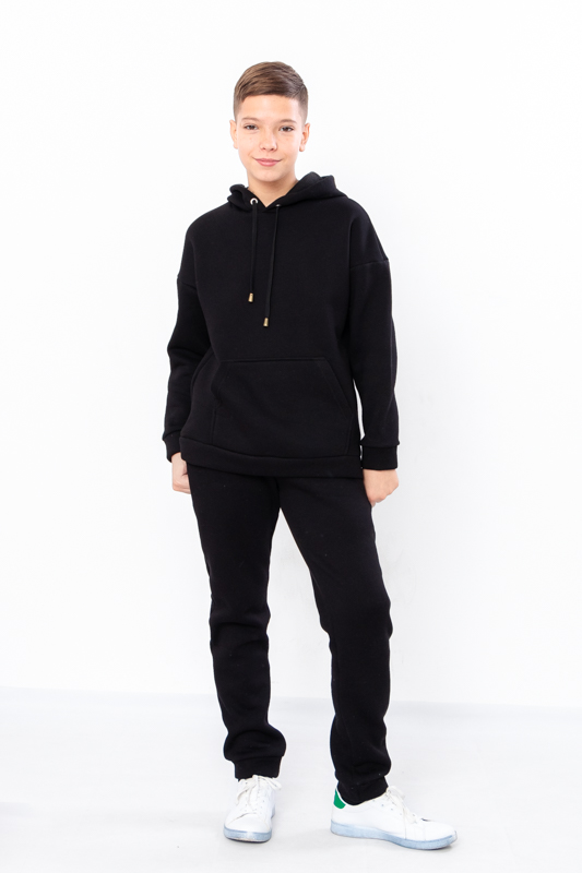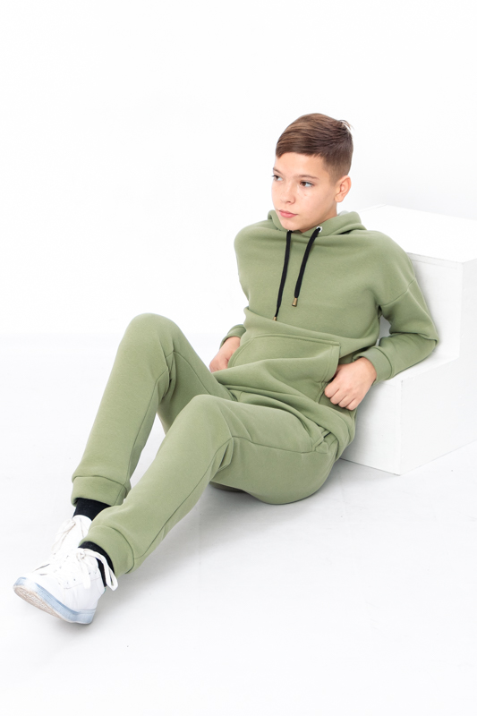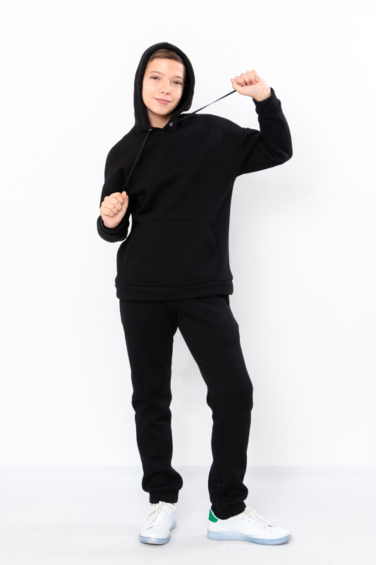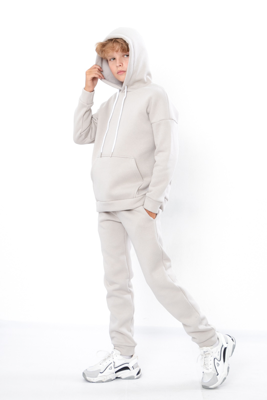 Базовий теплий костюм для хлопчика виконан з однотонної тринитки на начосі. Складається з худі та штанів. Худі з капюшоном, спереду є кишеня "кенгуру". Лінія плечей на рукавах спущена. Штани на широкій зручній резинці, по бокам є кишені. Костюм пошит в базових відтінках на будь-який смак. Такий костюм відмінно підходить на холодну погоду. Полотно щільне, має густий начіс з виворітної сторони, гарно зберігає тепло.