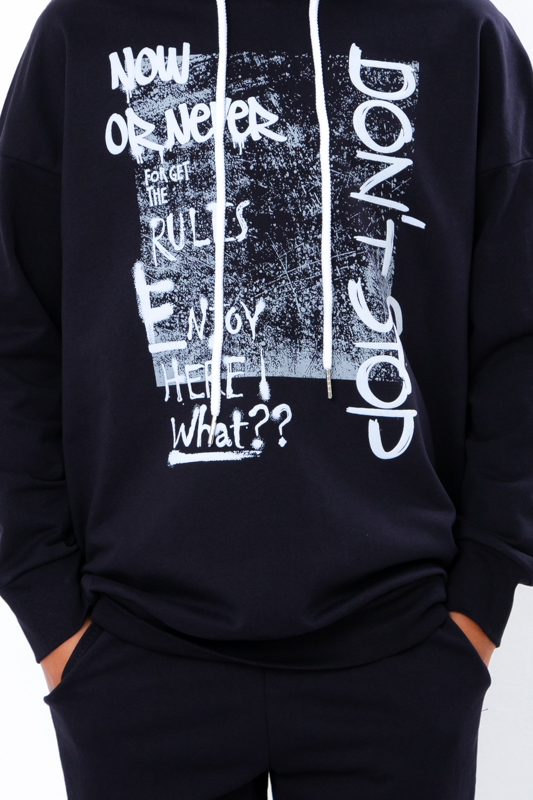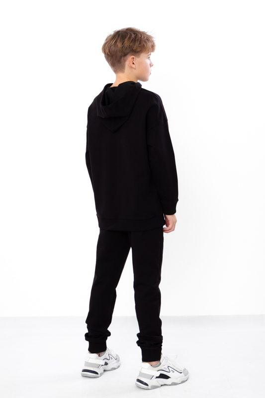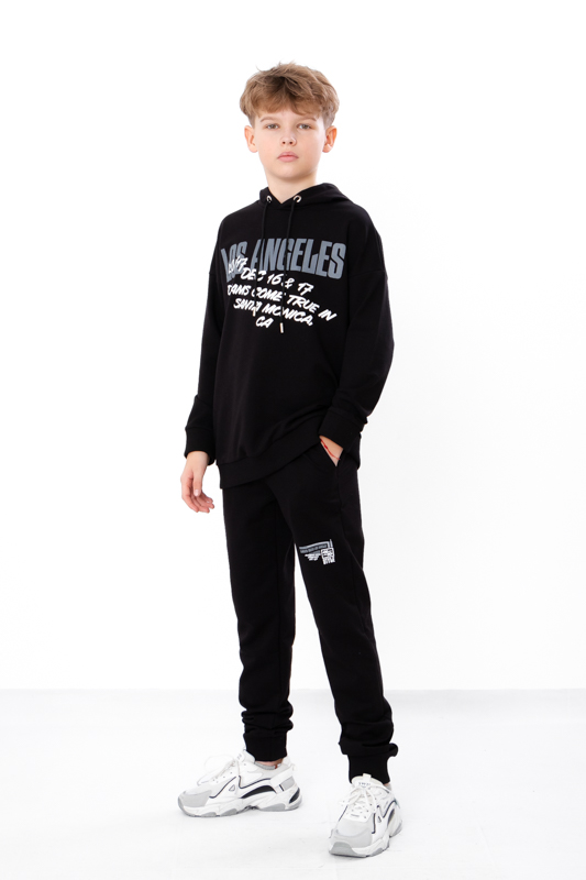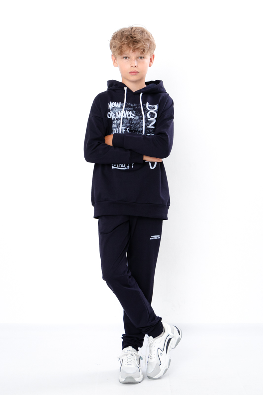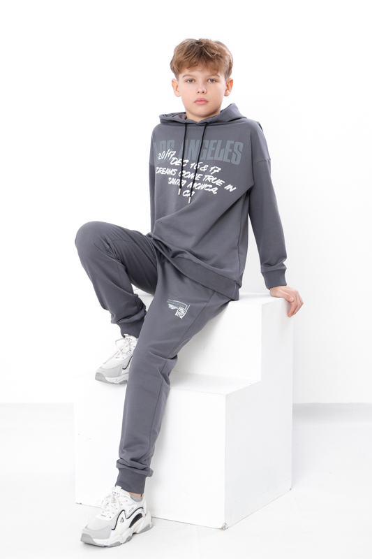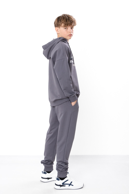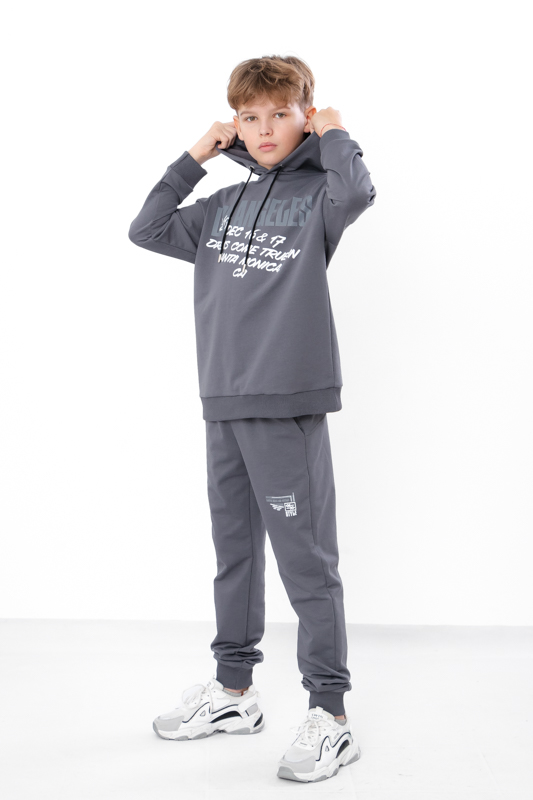 Костюм для хлопчика підлітковий пошит з однотонної двонитки. Костюм складається з худі та штанів. Худі з капюшоном, на рукавах та по низу широкі еластичні манжети. Штани на широкій зручній резинці, по бокам є дві кишені. На штанах та спереду на худі нанесений стильний накатний малюнок. Костюм можна доповнити кросівками або кедами. Підходить для повсякденного носіння, занять спортом або активних прогулянок. Полотно гарної якості. Тому, при правильному догляді, виріб можна буде носити не один сезон. Може давати усадку після прання.