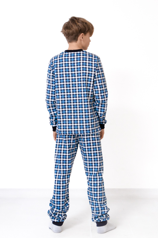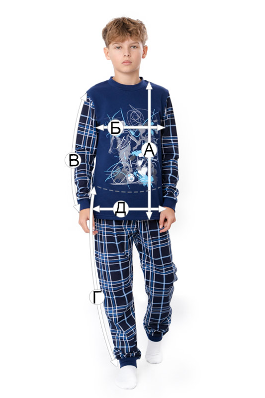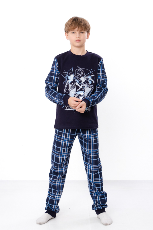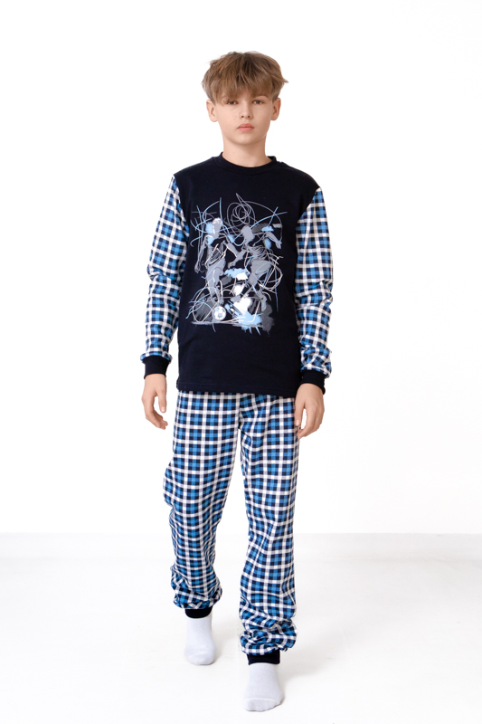 Комплект складається з кофти та штанів. Верх виготовлений із принтованого начосу з оригінальним малюнком — він додає піжамі сучасного вигляду та сподобається хлопчикам, які люблять яскраві образи. Рукави й штани оздоблені тканиною в класичну клітинку темно-синього відтінку, що гармонійно поєднується з основним кольором кофти. Такий дизайн виглядає стильно та лаконічно, підкреслюючи індивідуальність дитини.