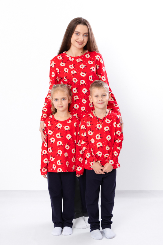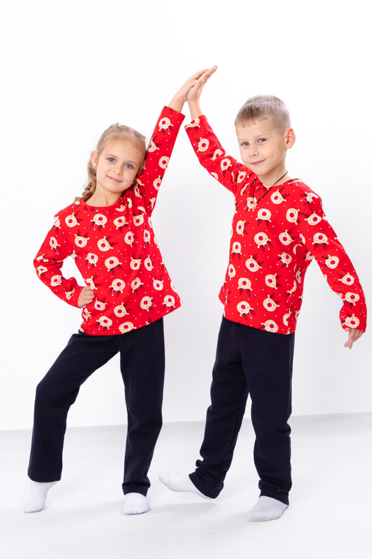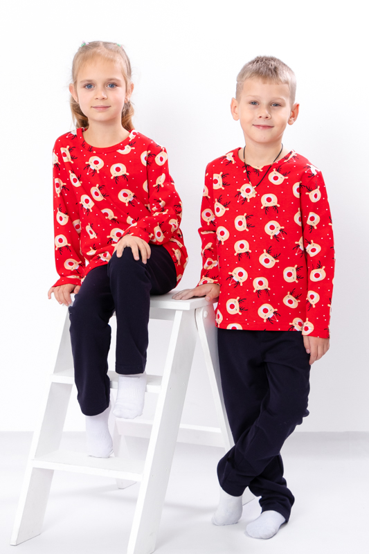 Дитячий одяг для сну має бути особливо якісним і зручним. У комплекті - класична пара:иштани і кофта з довгим рукавом. Штани прямі. На талії вони тримаються за допомогою резиночки. Модель виконана з набивного начосу, який декорований новорічним принтом.