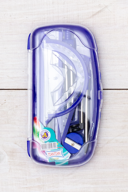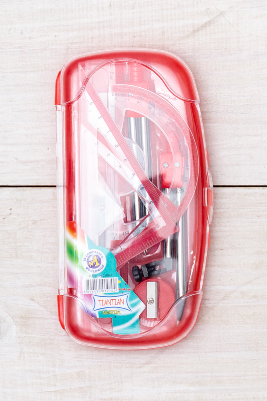 У наборі 8 предметів: циркуль під олівець (довжина - 12 см), ластик, простий олівець (довжина - 8,5 см), точилка, лінійка (довжина - 15 см), транспортир, 2 трикутника.