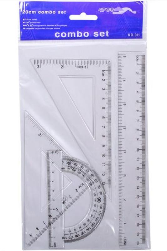 У комплект входить лінійка 20см, трикутник (30*90*60), транспортир, трикутник (45*90*45).
