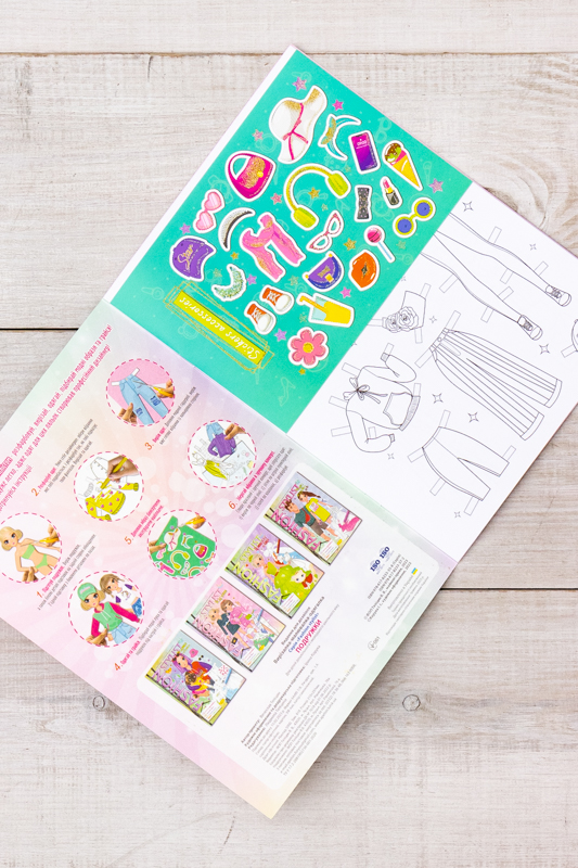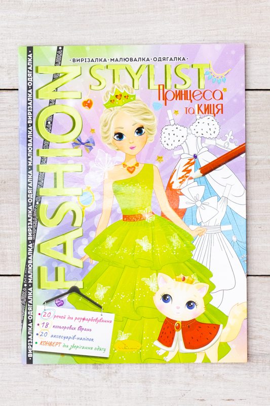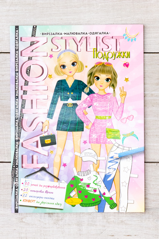 Розмальовка - одягалка - вирізалка "Fashion Stylist" : підготовь подружок, розфарбуй одяг, виріж вже готове вбрання, доповни образ блискучими аксесуарами-наліпками. Формат А4, 6ар та лист з наліпками. 30речей для розфарбовування, 20 кольорових вбрань, 22 аксесуари-наліпки, конверт для зберігання обягу.