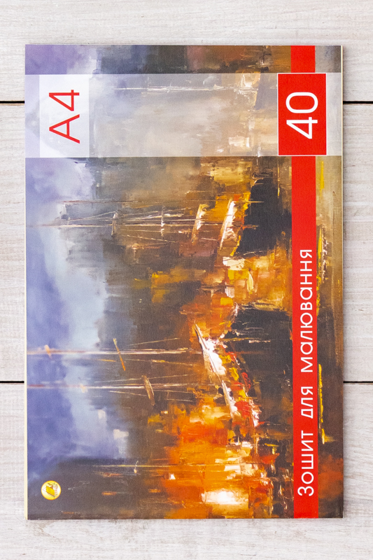 Альбом для малювання формату А4 з 40 аркушами. Щільність паперу 100 г/м2 з додатковою пухкістю 20%, що дозволяє малювати олівцями, акварельними і гуашевими фарбами, фломастерами. Аркуші оснащені перфорацією для легкого виривання. Обкладинка з картону щільністю 200 г/м2 захищає аркуші від деформації. Внутрішній блок виготовлений з офсетного паперу, білизна 100%, щільність 100 г/м2 з пухкістю 20%. Аркуші скріплені клеєвою стрічкою.