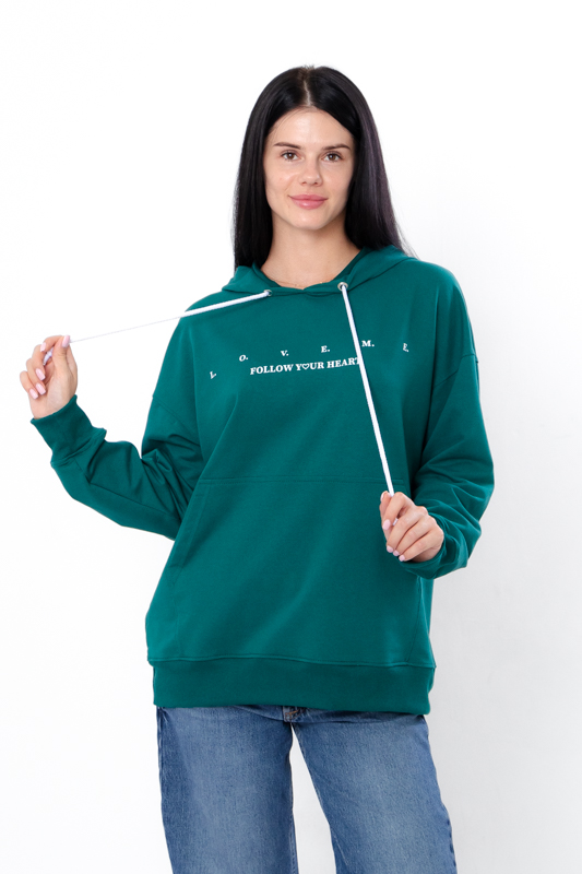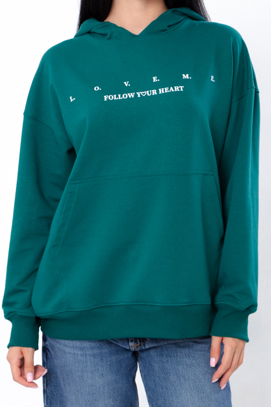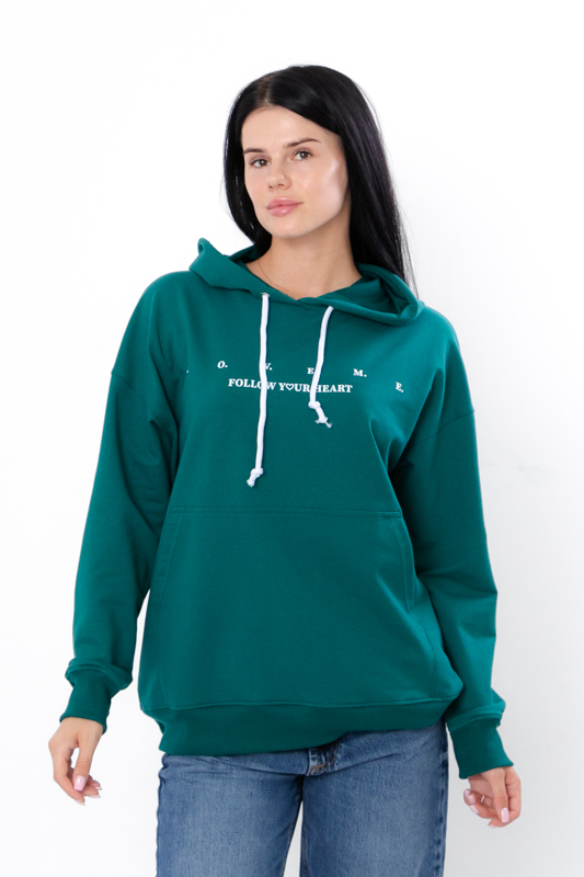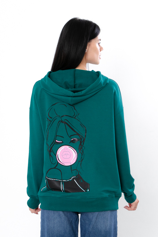 Худі для жінок у стилі "Оversize" пошите з однотонної двонитки. Модель з капюшоном, кишенею "кенгуру", має спущену лінію плечей. На рукавах та по низу худі широкі еластичні манжети. На спині нанесений стильний накатний малюнок, також спереду нанесений напис. Така річ є універсальною, може комбінуватися з будь-якими брюками, лосинами, джинсами, стане незамінною річчю у прохолодну пору року.