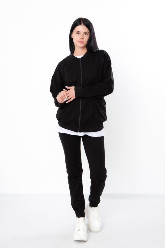 Стильний жіночий костюм складається з кофти та штанів. Пошит з однотонної двонитки в декількох кольорах. Кофта з округлою горловиною на блискавці, на рукавах та по низу широкі еластичні манжети, по бокам є кишені. Штани завужені до низу, пояс на зручній резинці. На штанинах також є манжети. Такий костюм поєднується з різноманітними однотонними або кольоровими футболками. Образ можна доповнити кедами або кросівками. Костюм чудово підійде на прохолодну погоду. Полотно гарної якості. Тому, при правильному догляді, його можна буде носити не один сезон. Може давати усадку після прання.
