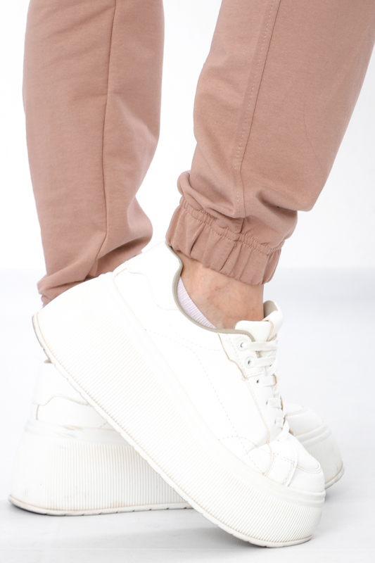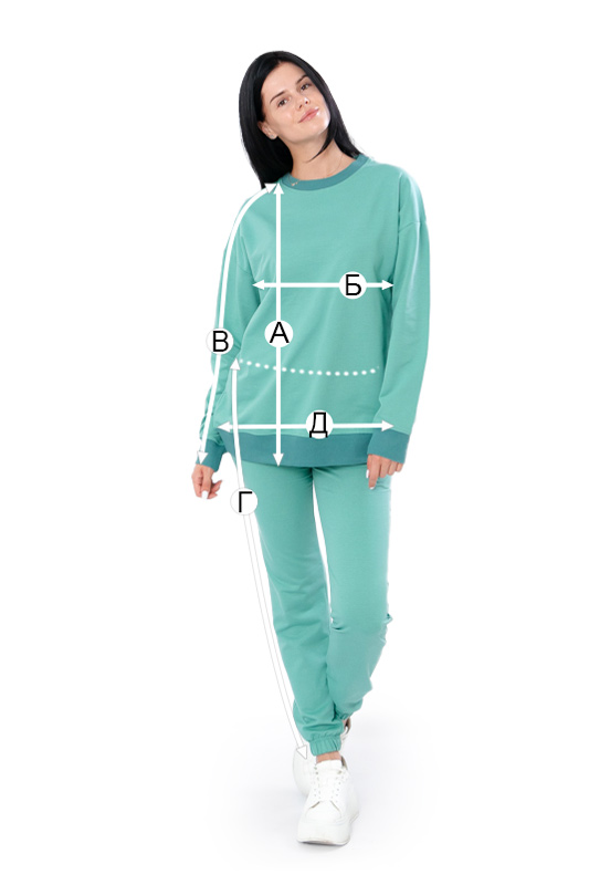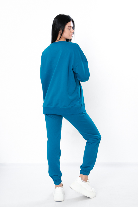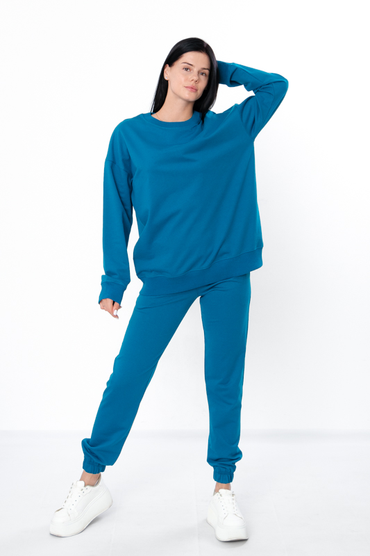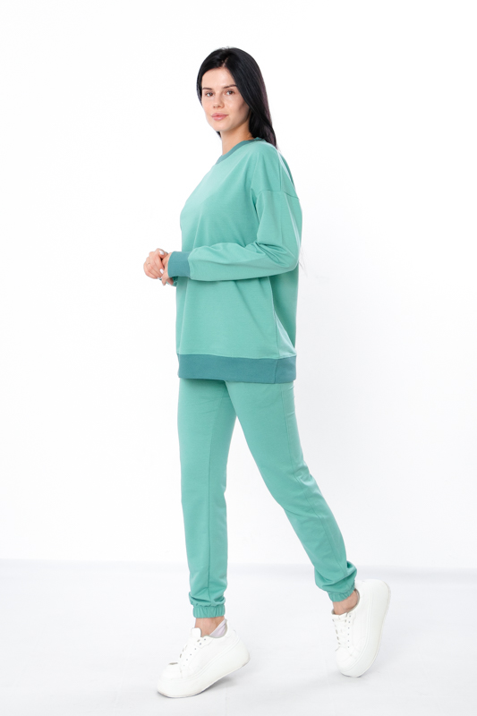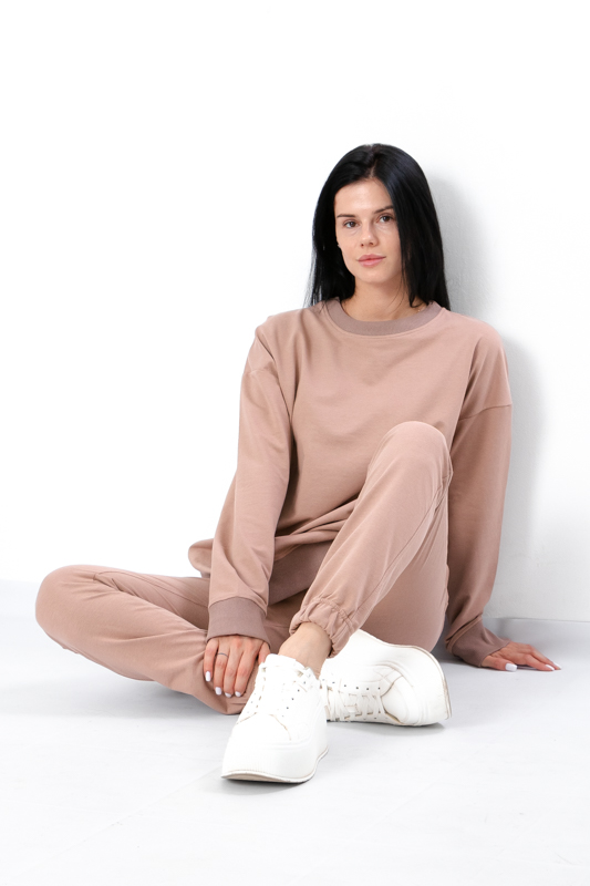 Жіночий костюм з однотонної двонитки складається зі світшоту та штанів. Світшот має округлу горловину, широкі еластичні манжети на рукавах та по низу. Штани трохи завужені до низу, з бічними кишенями по боках, пояс на широкій зручній резинці, манжети також на резинці. Полотно гарної якості. Тому, при правильному догляді, його можна буде носити не один сезон. Може давати усадку після прання.