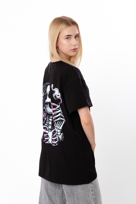 Футболка має сучасний вільний силует — крій oversize не тільки виглядає стильно, а й дозволяє легко адаптувати річ до будь-якого типу фігури. Спущена лінія плеча, просторий рукав і достатня довжина роблять цю модель зручною й універсальною. Вона ідеально підходить для створення relaxed-образів, а ще — чудово виглядає як навипуск, так і заправленою в джинси або шорти.
