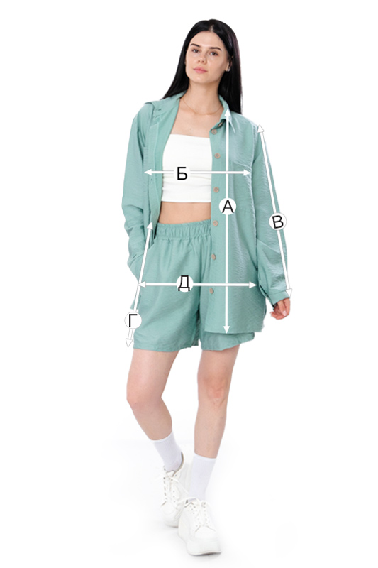 Стильний костюм для жінок виконаний з легкого полотна льон-жатка. Модель складається з сорочки, в стилі оversize та шортів. Шорти мають дві кишені та широкий пояс на резинці. Сорочка з довгими рукавами, застібається на гудзики, має дві кишені та комір.