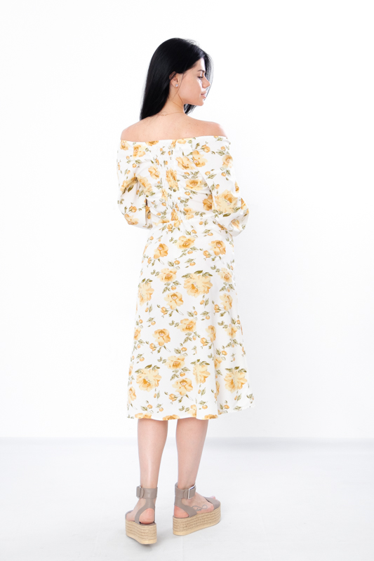 Сукня має подовжений рукав, який знизу прикрашає рюша. Широка округла горловина регулюється шнурочком, завдяки чому рукава можна спустити на плечі. Це зробить образ більш романтичним.