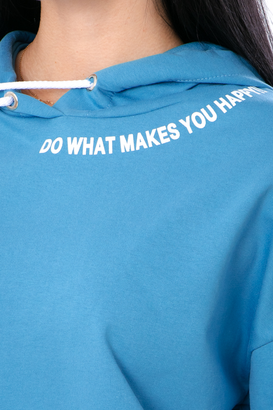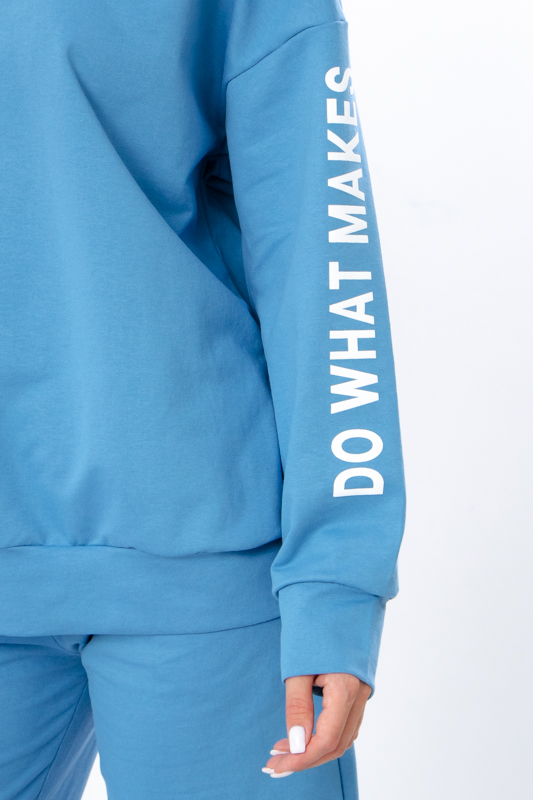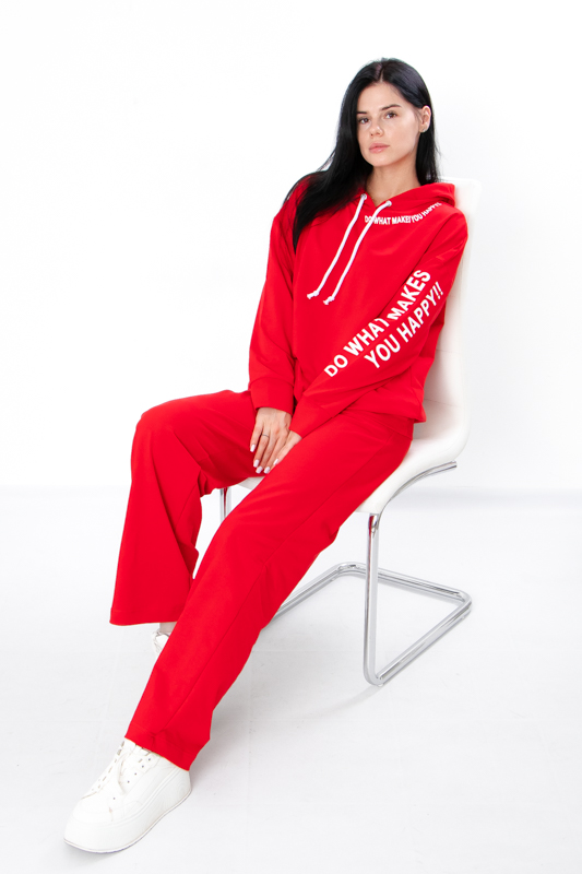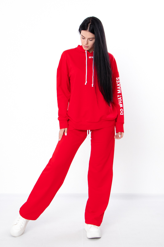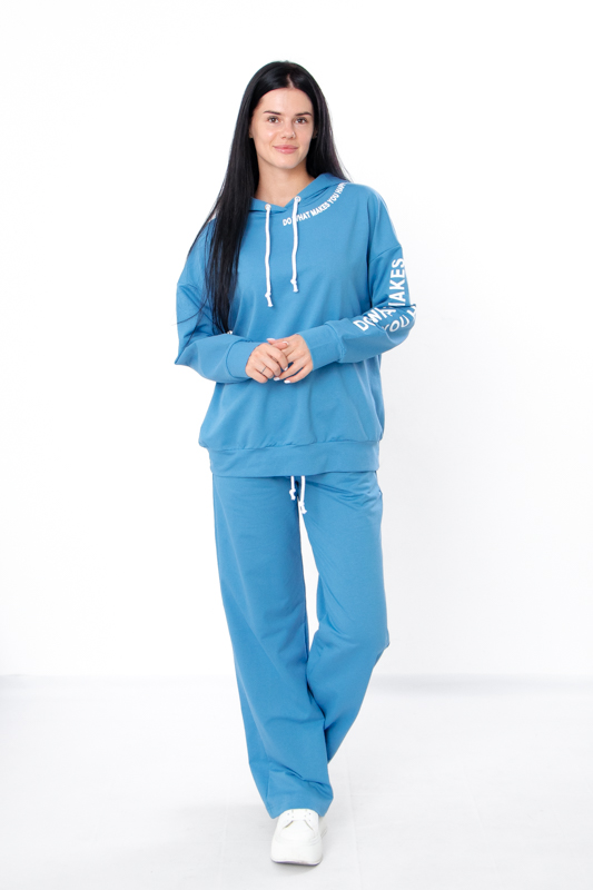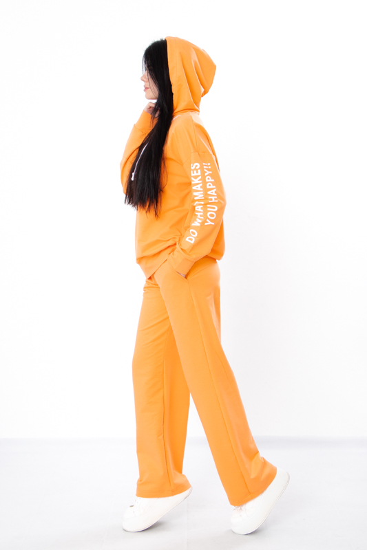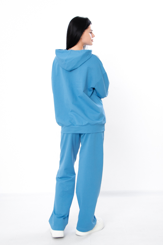 Стильний жіночий костюм з однотонної двонитки. Складається з худі та штанів вільного прямого крою. Худі з капюшоном, який регулюється шнурком. На рукаві та спереду худі нанесений накат в якості декору. Штани на широкій зручній резинці теж зі шнурком для регулювання на талії. По бокам є кишені для зручності. Такий костюм відмінно підійде для повсякденного носіння в прохолодну погоду. Пошитий в декількох кольорах на будь який смак. Костюм можна доповнити кедами або кросівками. Полотно гарної якості. Тому, при правильному догляді, його можна буде носити не один сезон. Може давати усадку після прання.