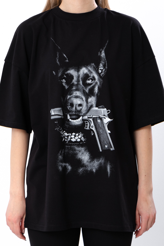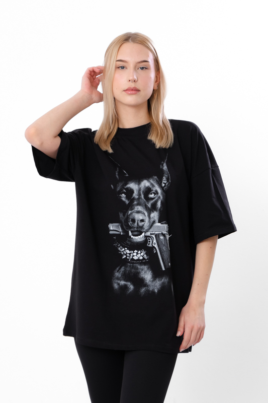 Жіноча футболка оверсайз від Трикотажний Край — це сміливе поєднання стилю та комфорту. Виготовлена з якісної фулікра — еластичної та приємної до тіла тканини, вона дарує максимальну зручність і добре тримає форму. Дизайн привертає увагу — ефектний принт добермана з пістолетом у зубах додає образу впевненості та характеру. Така футболка ідеально пасує до повсякденного гардеробу, дозволяючи легко створювати сучасні та зухвалі луки.