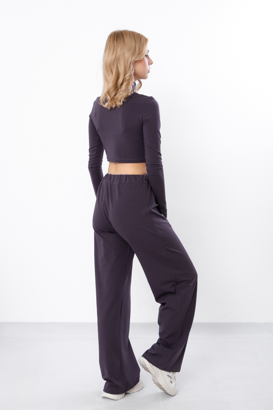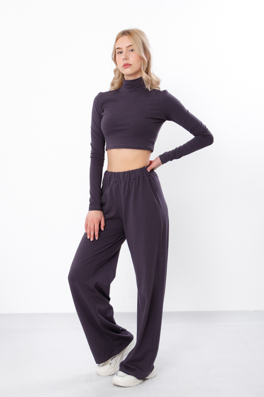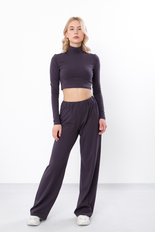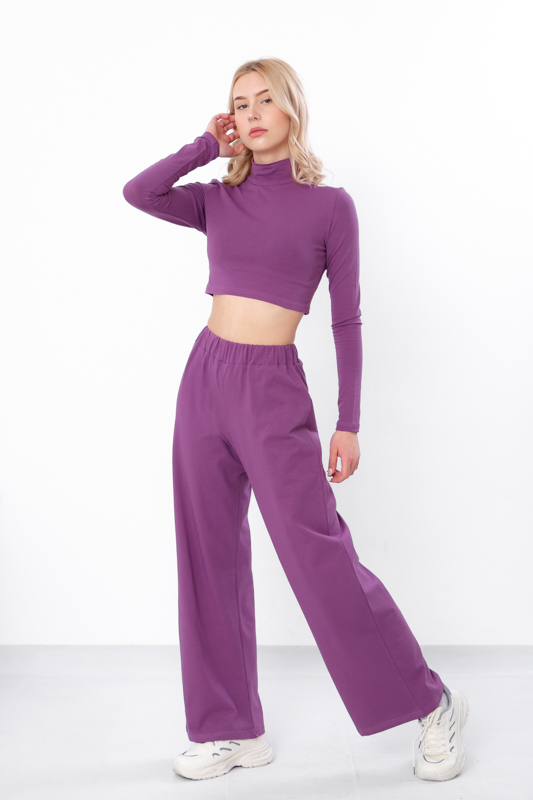 Жіночий костюм із фулікра однотонної — це вдале поєднання комфорту, зручності та сучасного стилю. Модель складається з лаконічного кроп-топа з довгим рукавом і високої горловини та штанів вільного крою на резинці, що не сковують рухів і підкреслюють фігуру. М’яке та еластичне полотно приємне до тіла, добре пропускає повітря, забезпечуючи максимальний комфорт протягом дня. Костюм ідеально підходить для прогулянок, домашнього відпочинку, занять спортом або створення стильного кежуал образу. Завдяки актуальній кольоровій палітрі легко комбінується з іншими елементами гардеробу.