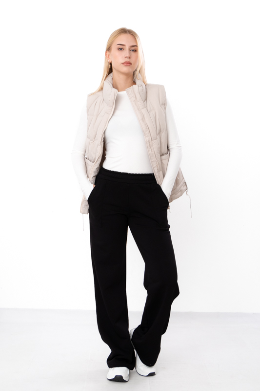 Полотно трьохнитка петля відоме своєю міцністю та здатністю тримати форму. Це тканина, яка не лише приємна на дотик, а й чудово пропускає повітря, дозволяючи шкірі дихати протягом усього дня. Відсутність начосу робить їх легшими та зручнішими для міжсезоння й навіть для літа, адже вони не створюють відчуття зайвого тепла. Водночас матеріал зберігає щільність, тому штани виглядають акуратно та вигідно підкреслюють фігуру.