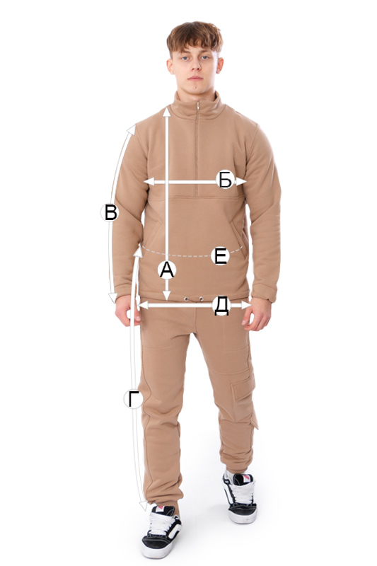 Полотно: трьохнитка петля з начосом (щільне трикотажне полотно, яке складається з трьох шарів ниток. З виворітної сторони тканина має начісування, що робить її надзвичайно теплою і комфортною для прохолодної погоди. З лицьового боку трьохнитка зазвичай має гладку поверхню, а з виворітного — петлі або начіс, що забезпечують теплоізоляційні властивості.)