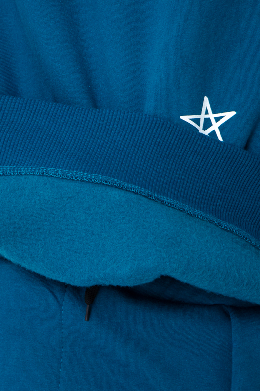 Костюм пошит з трьохнитки однотонної. Трьохнитка — це щільна трикотажна тканина, яка складається з трьох шарів ниток, що робить її особливо теплою та зносостійкою. Завдяки своїм властивостям, трьохнитка є ідеальним вибором для виготовлення верхнього одягу, спортивних костюмів і теплих худі.