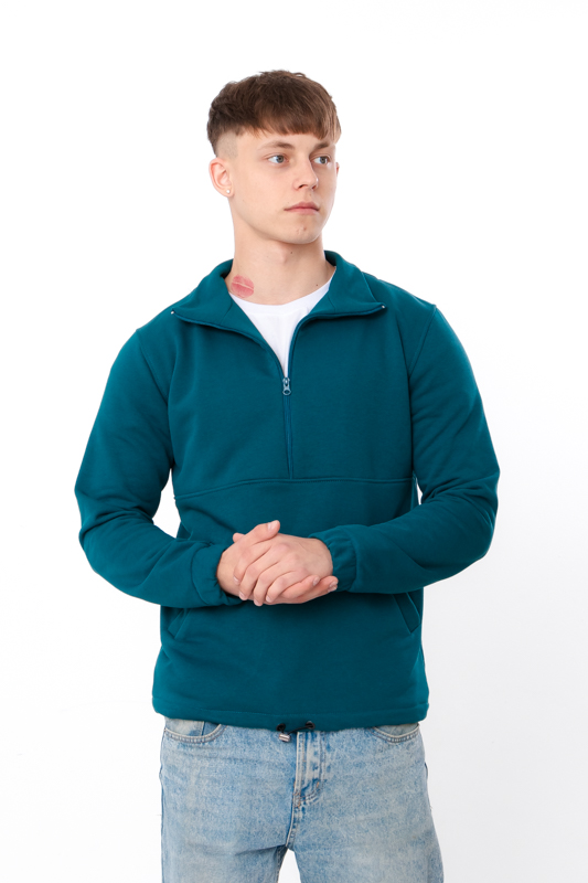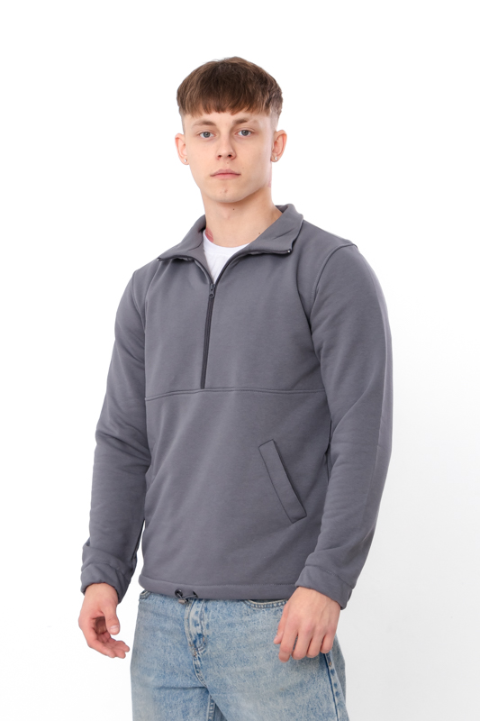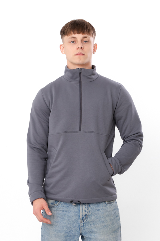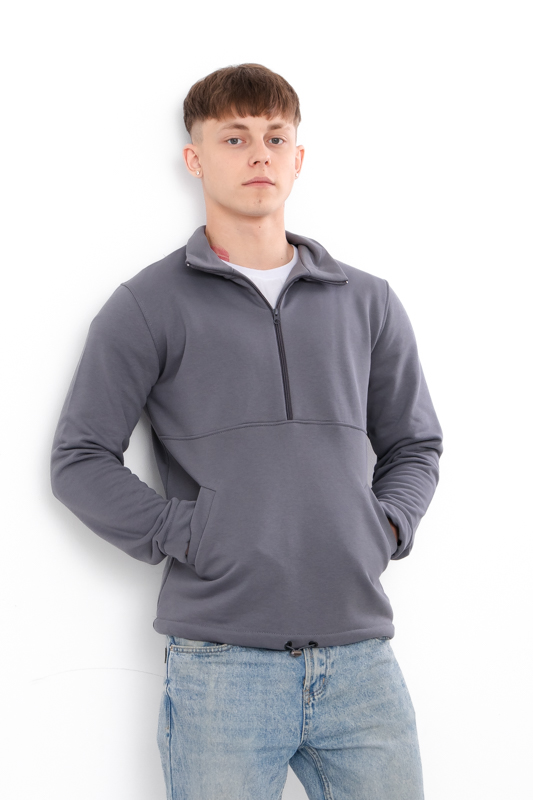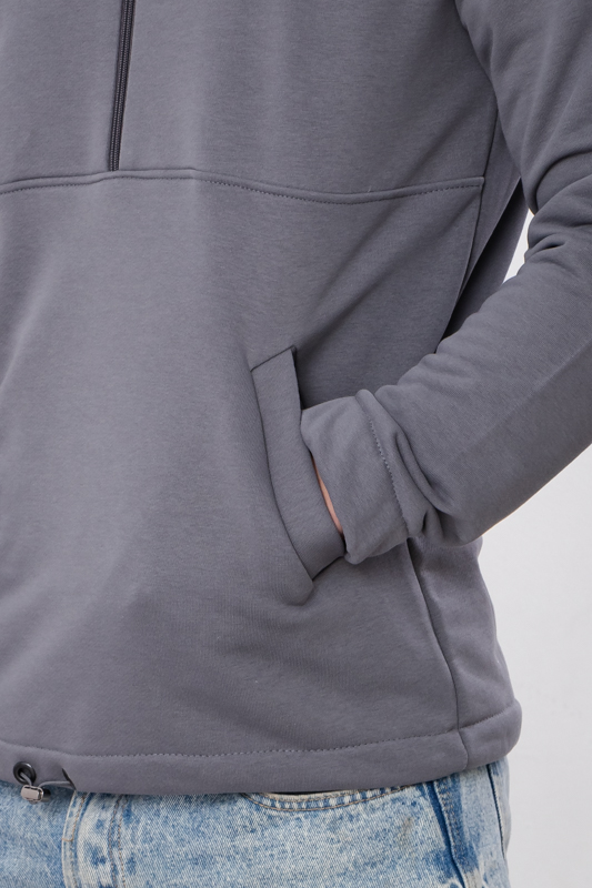 Джемпер має продуманий крій із зручним **коміром-стійкою на блискавці**, що дозволяє регулювати глибину вирізу залежно від погоди чи стилю. Такий елемент додає образу спортивного характеру, водночас зберігаючи лаконічність класичного силуету. Завдяки **м’яким манжетам і еластичному низу**, джемпер добре тримає форму й забезпечує комфорт під час руху. Об’ємна **кишеня-кенгуру** додає практичності — сюди зручно покласти руки або дрібні речі.
