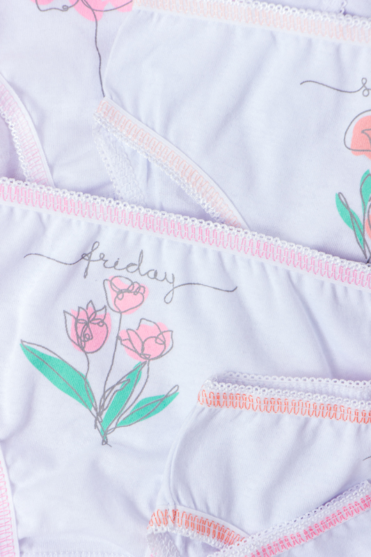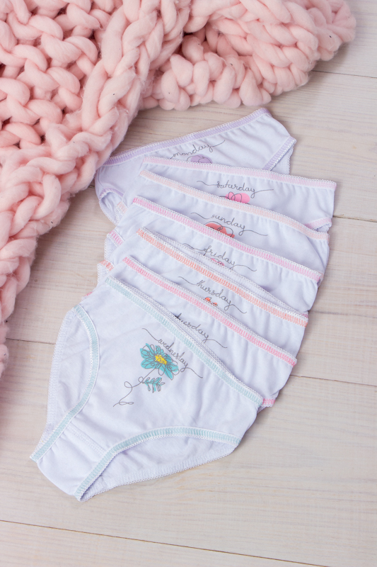 Дуже зручний для повсякденного носіння комплект «Неділька». Виконаний з білого куліру. В упаковці 7 од. трусів для дівчаток з накатом на кожен день тижня.