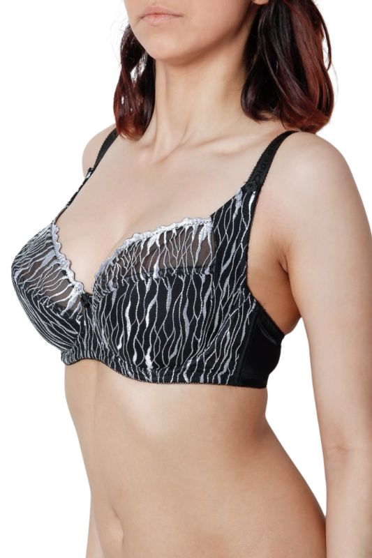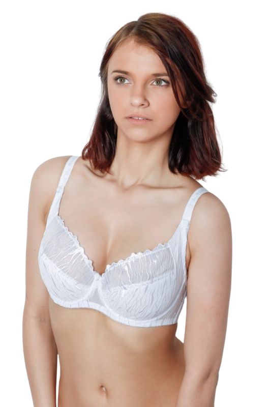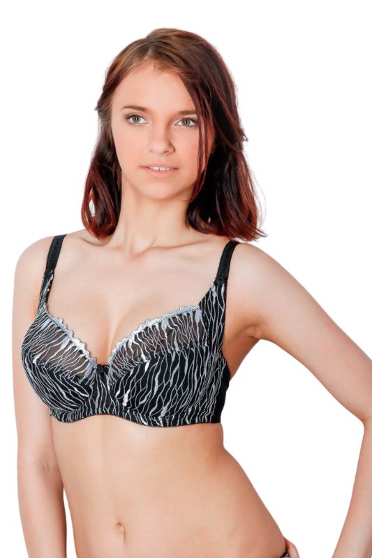 Бюстгальтер: класичний, мереживний. Тип чашок: повнорозмірні чашки з підкладкою. Наповнювач чашки тонкий поролон. Розмір чашки: D. Склад тканини: 82% нейлон, 18% еластан. Шви на чашках: діагональні шви. Кісточки: так. Перемичка: широка. Бічні частини ліфа: широка. Застібка: ззаду на два гачки. Бретельки: середні, незнімні.