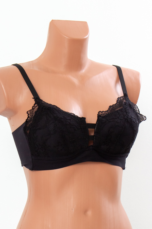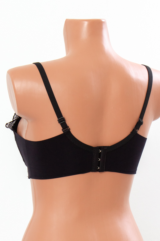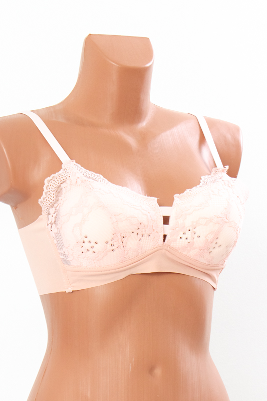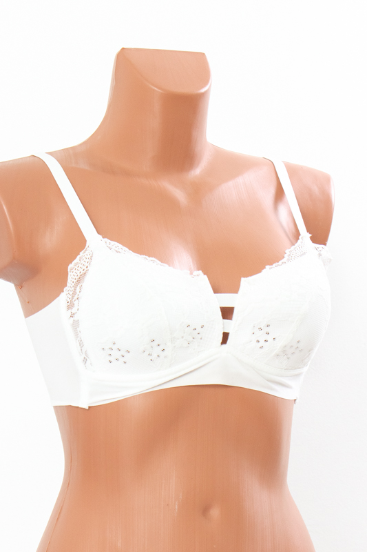 Бюстгальтер з мереживними чашками на тонкому поролоні та бічними кісточками. На внутрішній стороні чашок є перфорація, між чашками є дві перемички. Спинка широка, гладка, із застібкою на 3 гачки, бретелі не знімаються.