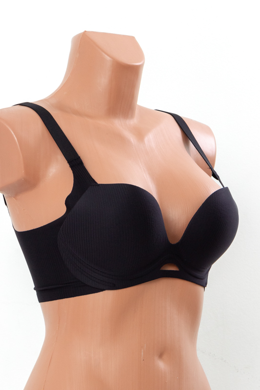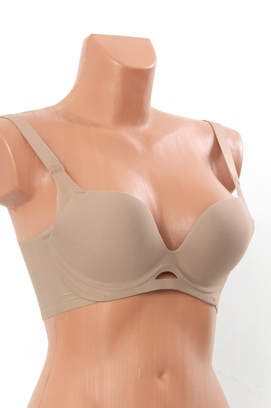 Формований бюстгальтер у рубчик без кісточок на широких бретелях. Спинка широка із застібкою на чотири гачки, бретелі не знімаються.