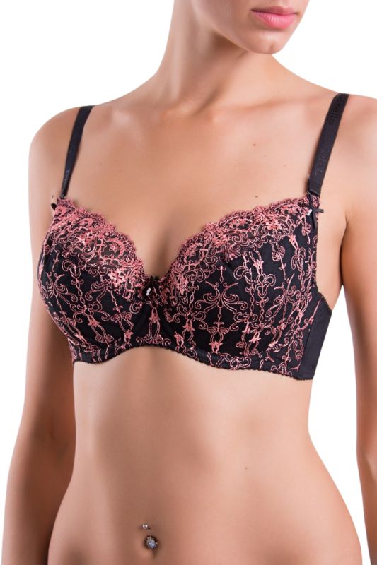 Бюстгальтер: мереживний. Тип чашок: повнорозмірні чашки з підкладкою. Наповнювач чашки: без поролону. Шви на чашках: діагональні шви. Кісточки: так. Перемичка: широка. Бічні частини ліфа: середня. Застібка: ззаду на один гачок. Бретельки: тонкі, знімні.