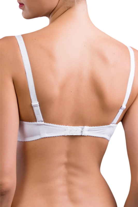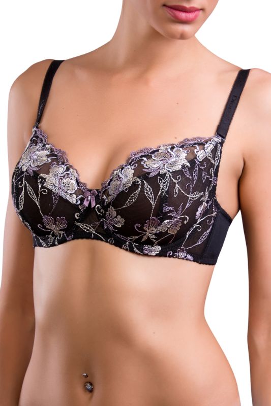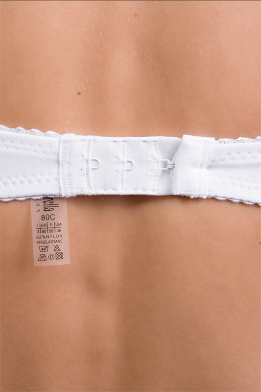Бюстгальтер: мереживний, прозорий. Вид чашок: повнорозмірні на тонкій бавовняній підкладці. Наповнювач чашки: без поролону. Розмір чашки: Склад тканини: 82% нейлон, 18% еластан. Шви на чашках: діагональні. Кісточки: так. Перемичка: широка. Бічні частини ліфа: середня. Застібка: ззаду на один гачок. Бретельки: середні, знімні.