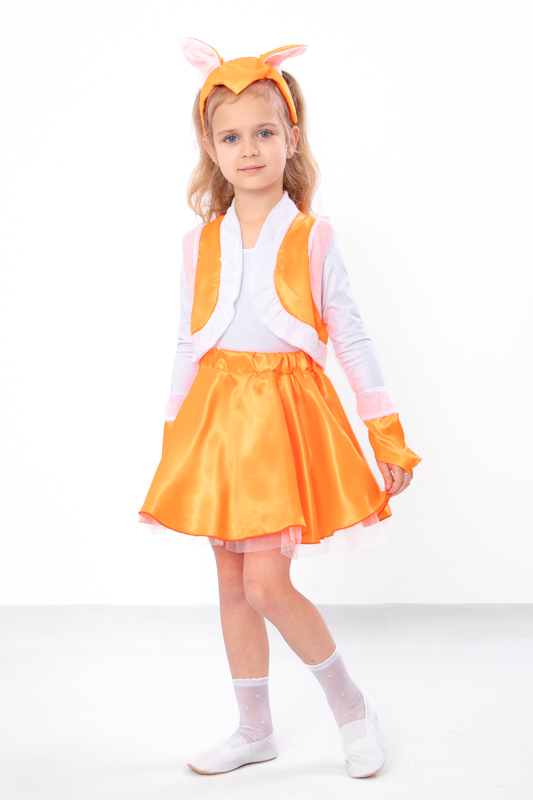 Чарівний карнавальний костюм дозволяє маленькій модниці відправитися на свято в ролі Лисички! Хитре і дотепне звірятко є героїнею багатьох казок, тому побувати в її ролі мріють багато маляток. Модель виконана з ряду полотен - атлас однотонний, велюр однотонний, фатин однотонний. У комплект костюма "Лисичка" входить: жилет, спідниця, обруч з вушками та рукавички. Порадуйте свою дитину карнавальним костюмом Лисички.