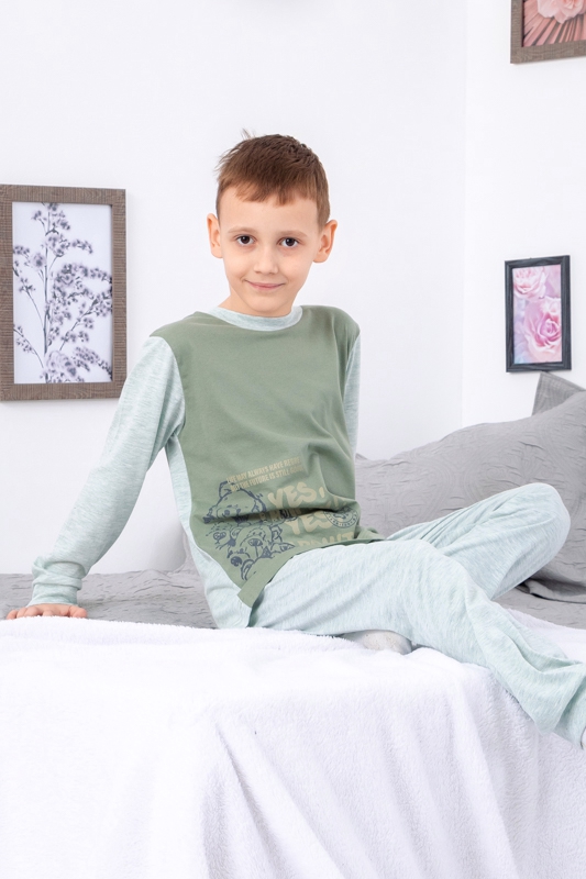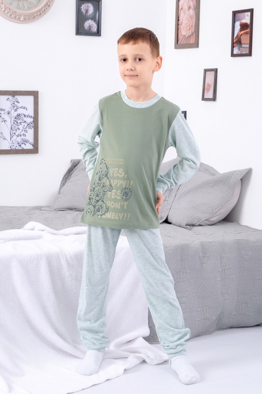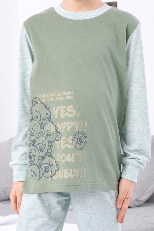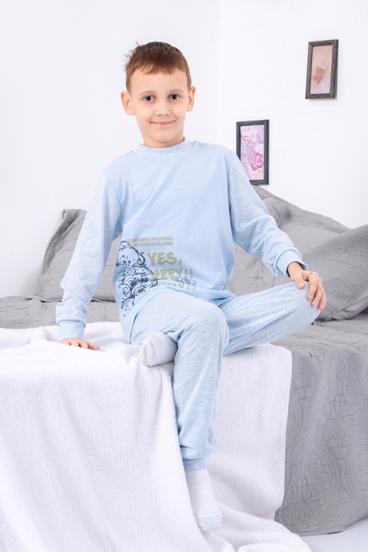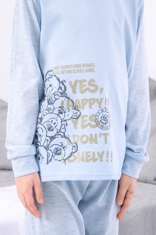 Зручна та стильна піжама для хлопчика з м’якого трикотажу (клір меланж) світло-блакитного кольору. Комплект складається з кофти з довгим рукавом та штанів. На передній частині кофти — яскравий принт з ведмедиками та мотиваційними написами англійською: "YES, HAPPY!! YES, DON'T LONELY!!"