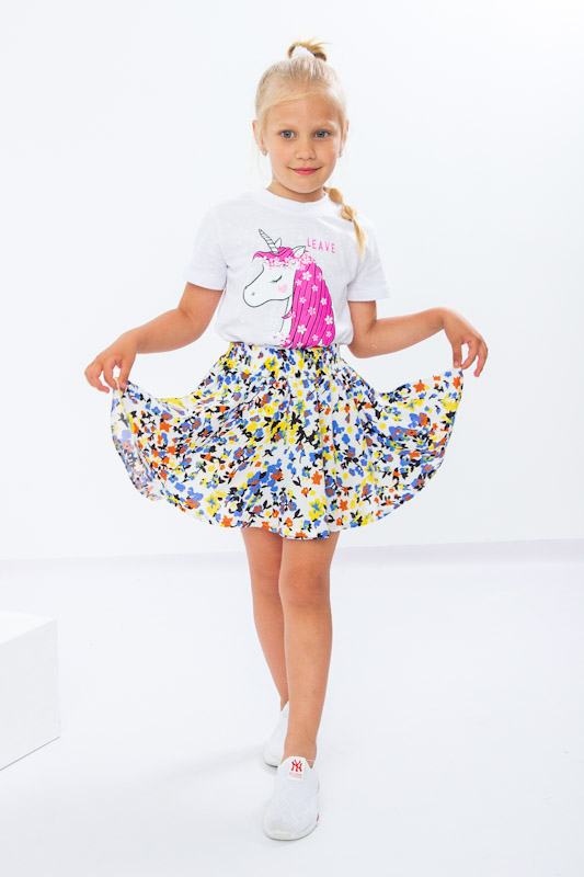 Модель має вільний крій, що надає легкості та дозволяє дитині почуватись вільно під час руху. Довжина вище коліна робить спідницю зручною для щоденного носіння, і водночас стильною — вона не обмежує активність, дозволяє грати, стрибати чи бігати з повним комфортом. Еластичний пояс м’яко фіксується на талії, не перетискає і легко адаптується до особливостей фігури дівчинки, що робить модель практичною для дітей різного віку.