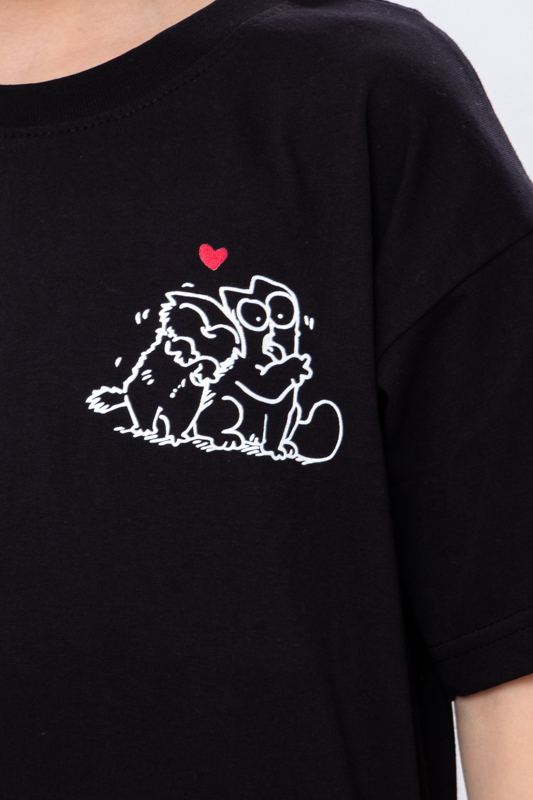 Ця чудова дитяча футболка "Family Look" стане частиною вашого особливого стилю разом з родиною. Виготовлена з високоякісного куліру, що забезпечує неймовірний комфорт і м'якість для вашої дитини. Футболка чорного кольору з принтом закоханних контурних білих котиків.