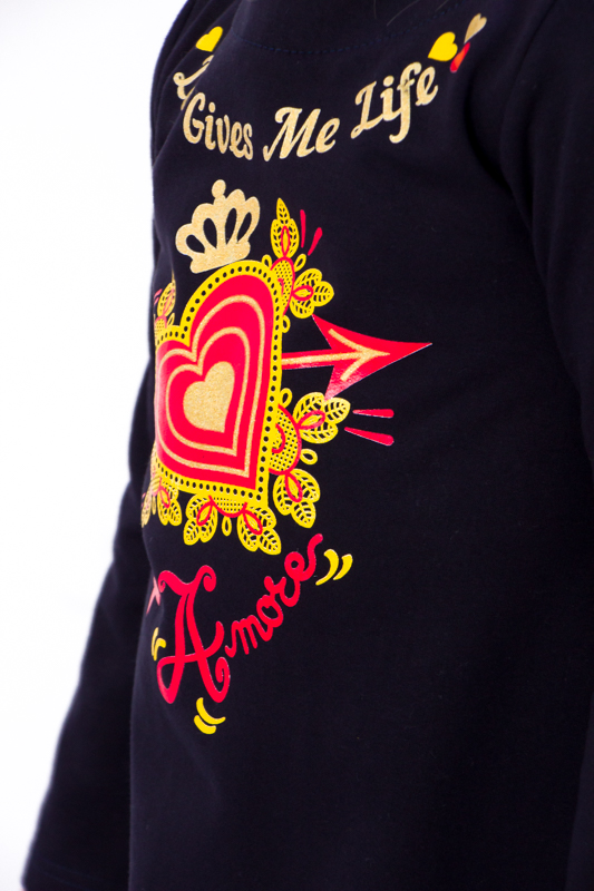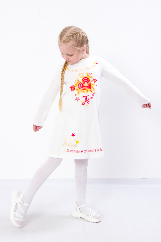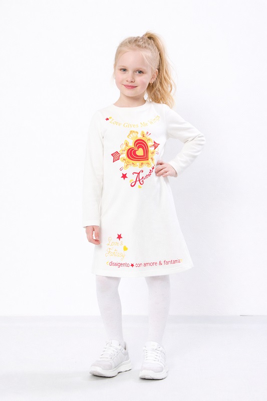 Особливістю цієї сукні є оригінальні принти на тканині, які роблять виріб яскравим і привабливим. Вони додають образу дитячої грайливості та неповторності. Такий дизайн легко поєднується як з повсякденним взуттям, так і з більш святковими варіантами.