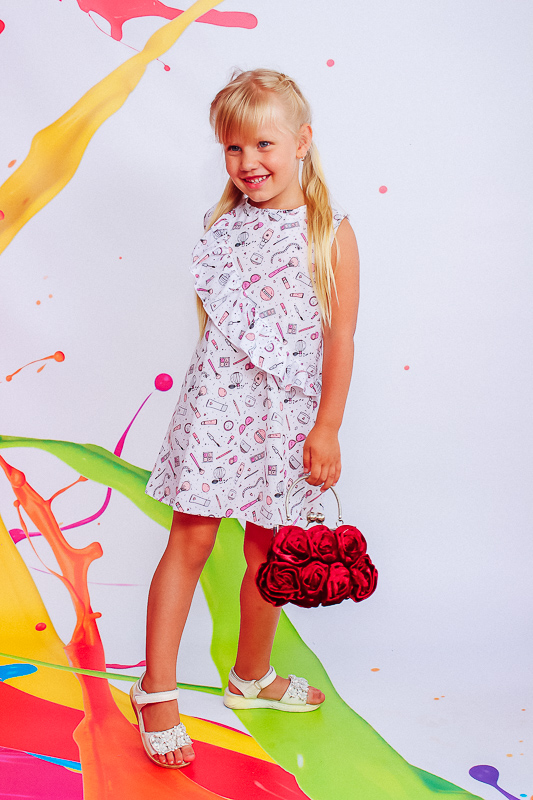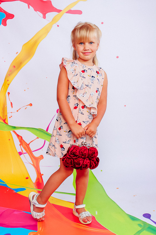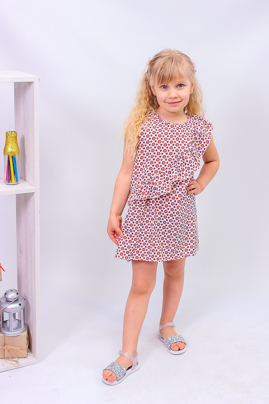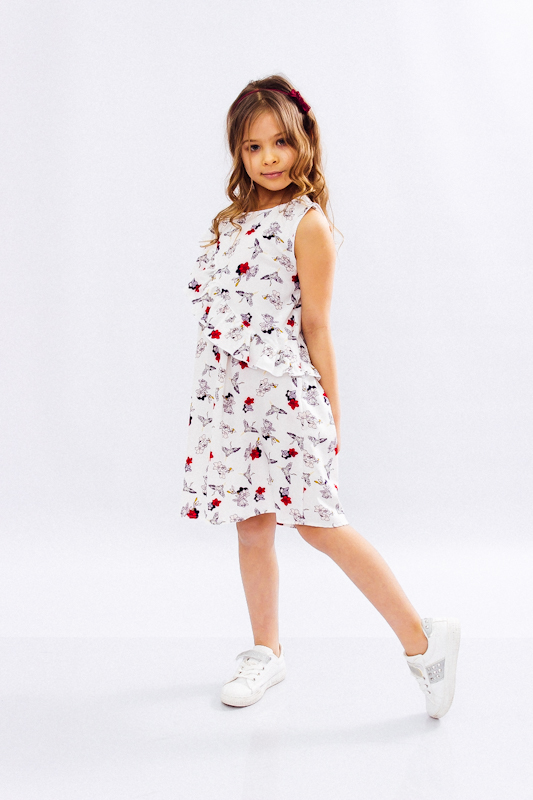 Сукня для дівчинки дошкільного віку. Виконана з тонкої тканини з набивним малюнком. Модель прямого силуету, без рукава. Виріз горловини круглий, прилеглий. Окрасою на сукні є злегка зібраний волан, який йде від плеча в бік лінії стегна. Він надає даній моделі легкості та краси. Тканина зберігає первісну кольоровість.