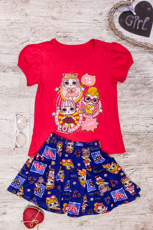 Чудовий комплект для дівчинки (спідниця + футболка) підійде і для урочистих заходів, і для щоденних прогулянок. Модель виконана в комбінації набивного і однотонного куліру. Кулір вважається найтоншим трикотажним полотном. Одяг з нього виходить легким. Футболка з рукавами-ліхтариками прикрашена барвистим накатом. Спідничка фіксується на талії еластичною резинкою. Така універсальна річ ніколи не стане зайвою в дитячому гардеробі.