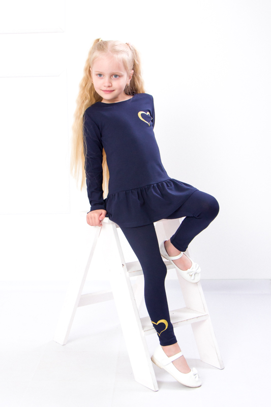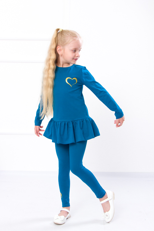 Комплект представлений у глибоких насичених кольорах — чорнильно-синьому та темній бірюзі. Вони чудово поєднуються з білим, сірим або пастельними відтінками взуття та аксесуарів. Цей набір стане улюбленим у гардеробі дівчинки завдяки поєднанню комфорту, естетики та практичності.