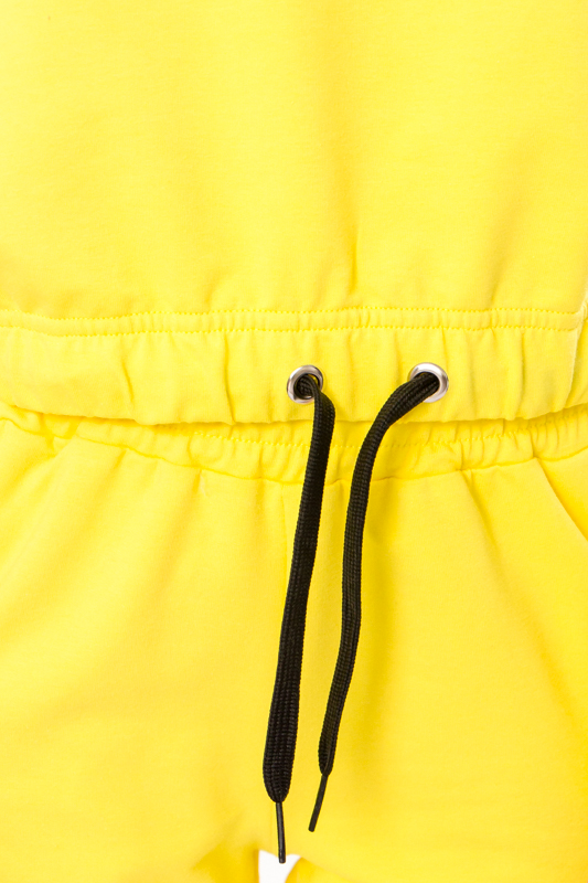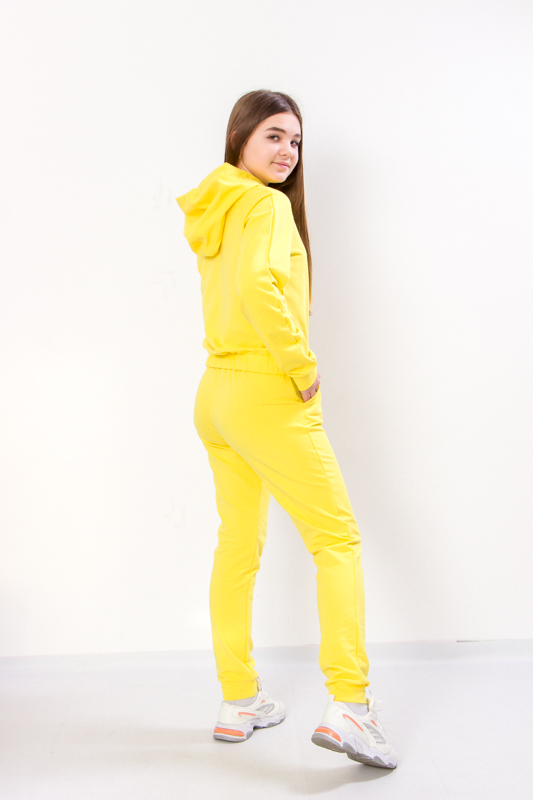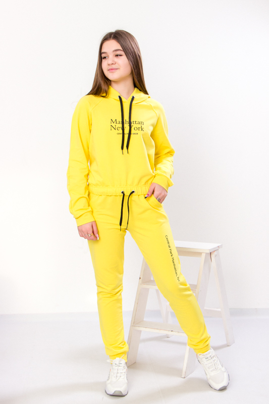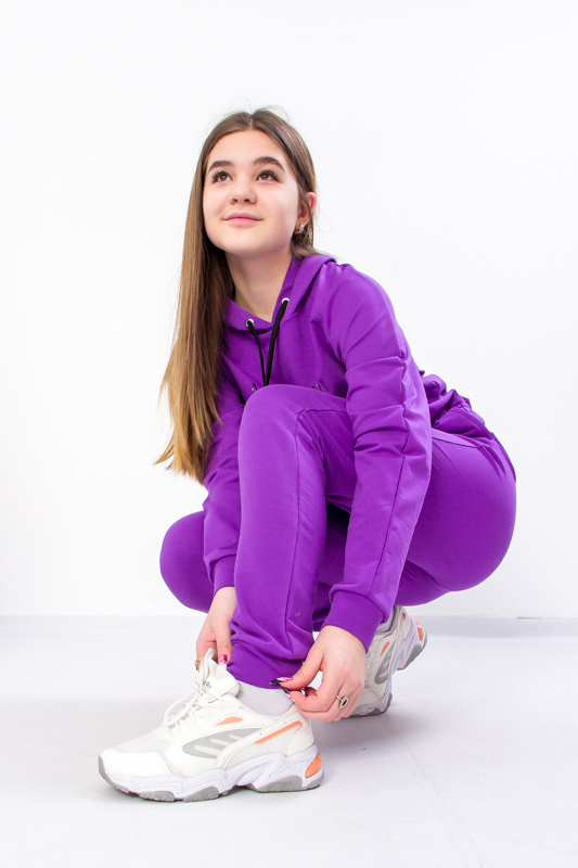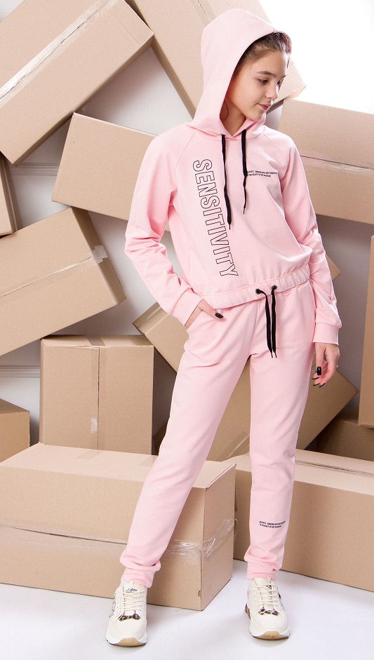 Костюм для дівчаток з однотонної двонитки, складається з джемпера та штанів. Джемпер з довгими рукавами та капюшоном, на рукавах та по низу є широкі еластичні манжети. Штани з кишенями, пояс на широкій резинці. Костюм прикрашений стильним написом. Полотно гарної якості. Тому, при правильному догляді, виріб можна буде носити не один сезон. Може давати усадку після прання.