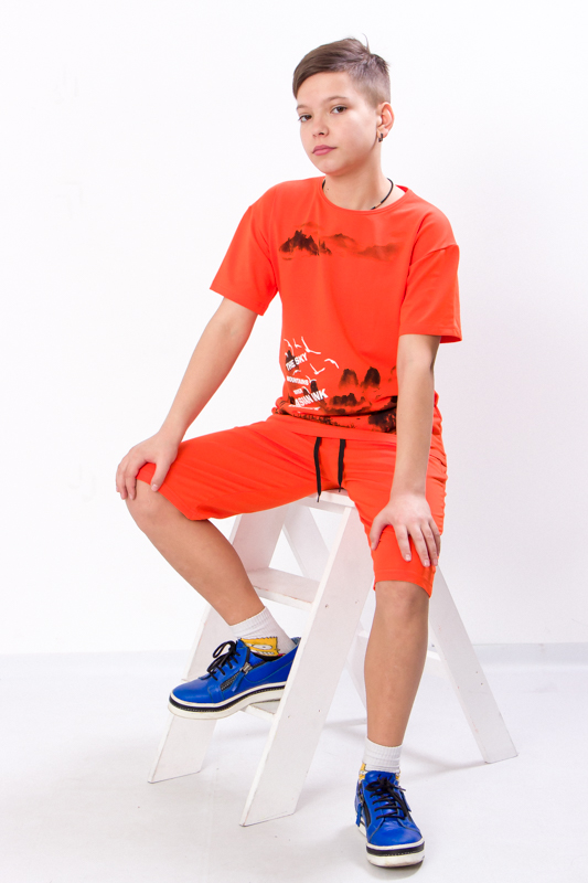 Футболка має вільний крій, короткий рукав і зручну горловину, що легко одягається через голову. Бриджі — середньої довжини, з еластичним поясом, який не тисне та добре тримається на талії. Модель не обмежує рухів, що особливо важливо для активних хлопчиків, які постійно в русі.