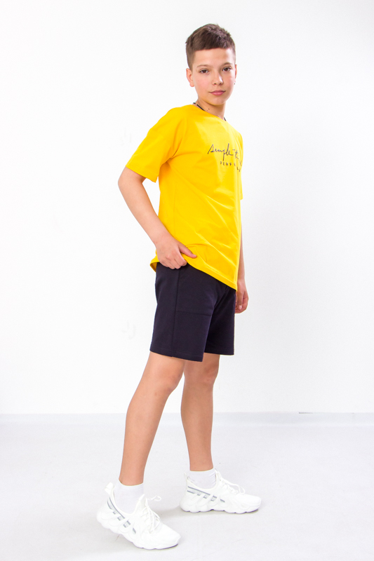 Літній комплект для підлітка складається з футболки та шортів. Футболка вільного крою з округлою горловиною, спущеною лінією плеча, виконана з гіпоалергенного, бавовняного полотна-фулікра однотонна (95% бавовна, 5% лайкра). Поличка декорована текстовим принтом, нанесеним у техніці шовкотрафаретного друку. Шорти довжиною вище коліна з бічними накладними кишенями та притачним поясом виконані з полотна двонитки (80% бавовна, 20% поліестер). Трикотажний комплект футболка та шорти відмінно підійде для підлітків на літо як повсякденний одяг, а також буде актуальним цілий рік для дому, до школи для занять фізкультурою або як тренувальний одяг для спорту, бігу, футболу, туризму. Костюм із шортами для хлопчика легко переться, не втрачає колір та форму, не скочується.