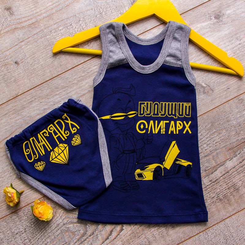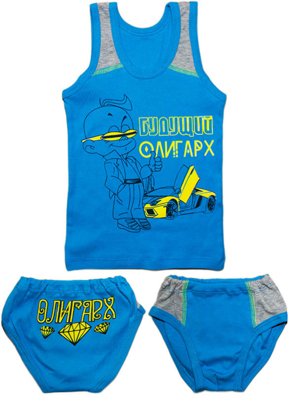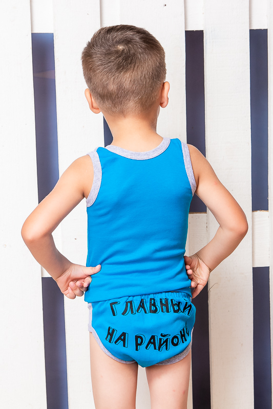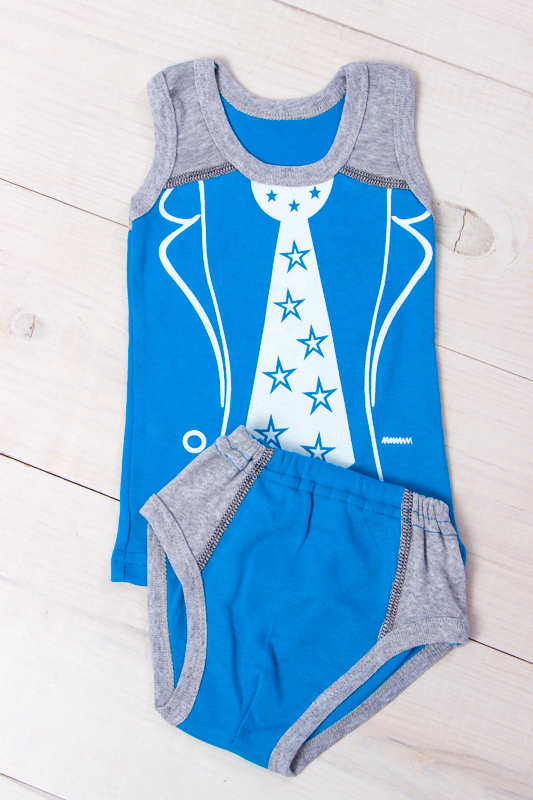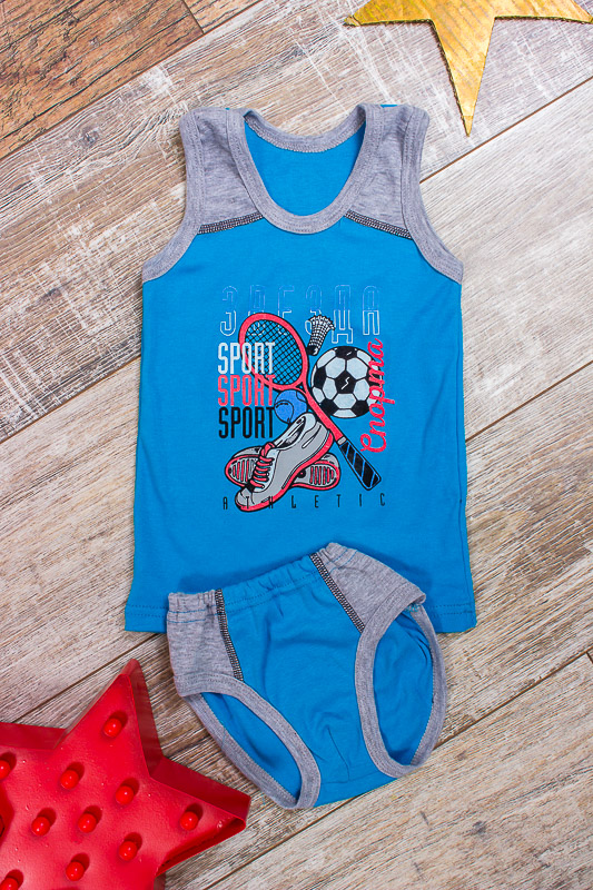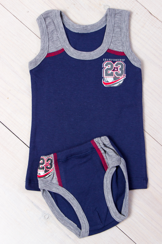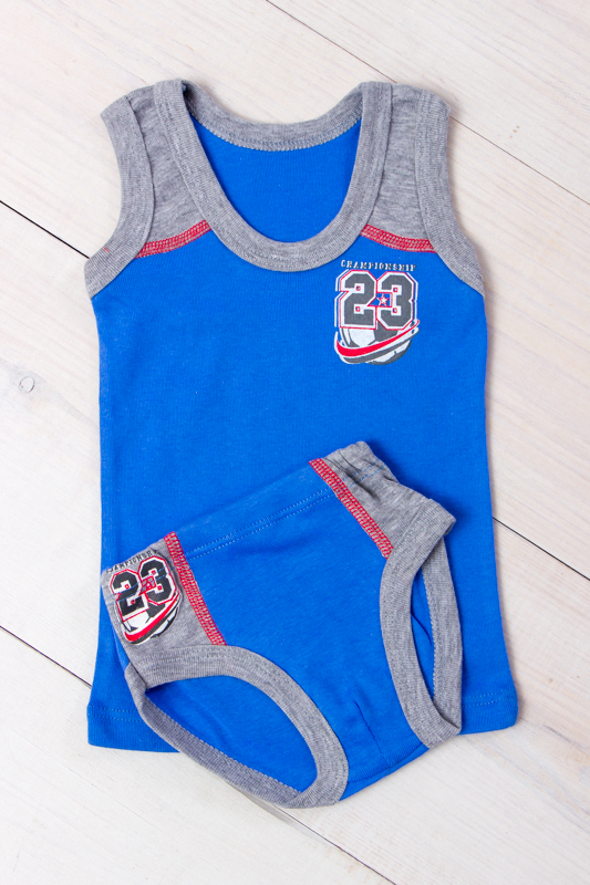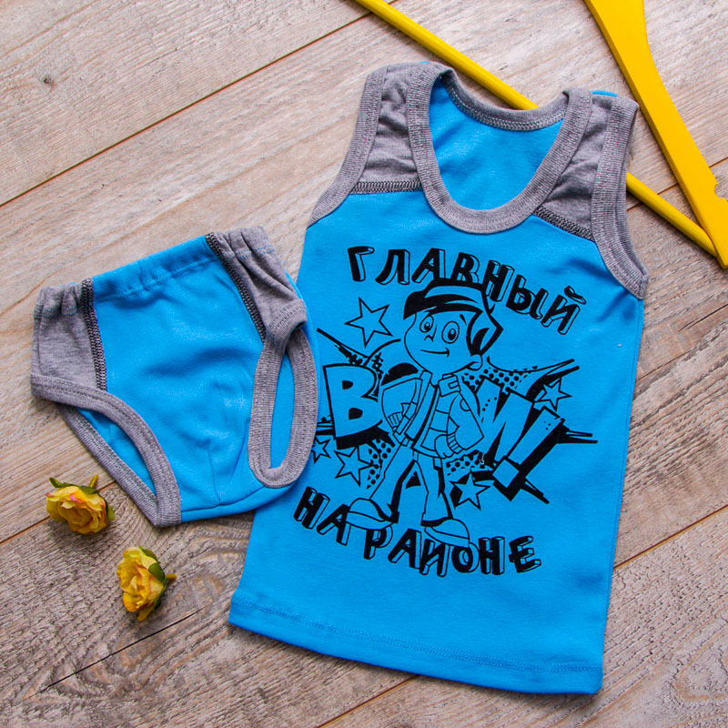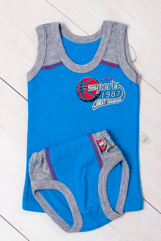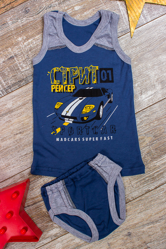 Класичний комплект для хлопчиків з однотонної рибани. У комбінації двох кольорів. Доповнено накатом на майці спереду, на трусиках - ззаду. Прекрасно тримає формуу. Цей трикотаж не сідає і прекрасно витримує велику кількість прання, при правильному догляді він не деформується і зберігає первинний вигляд.