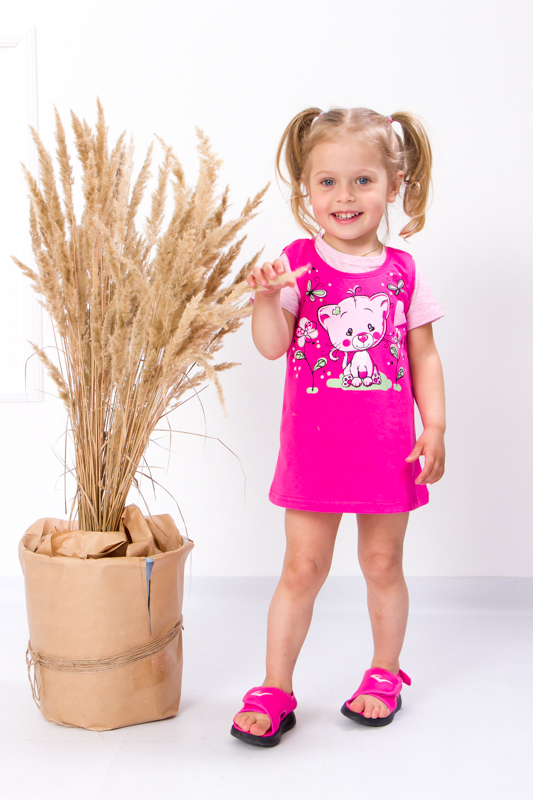 Футболка має класичний прямий крій із коротким рукавом і круглим вирізом. Вона легка, зручна й не сковує рухів, тому дитина почуватиметься вільно під час активної гри чи сну. Сарафан надягається поверх футболки — завдяки м’яким бретелям і вільному силуету він не тисне, легко одягається і додає образу ніжності та жіночності.