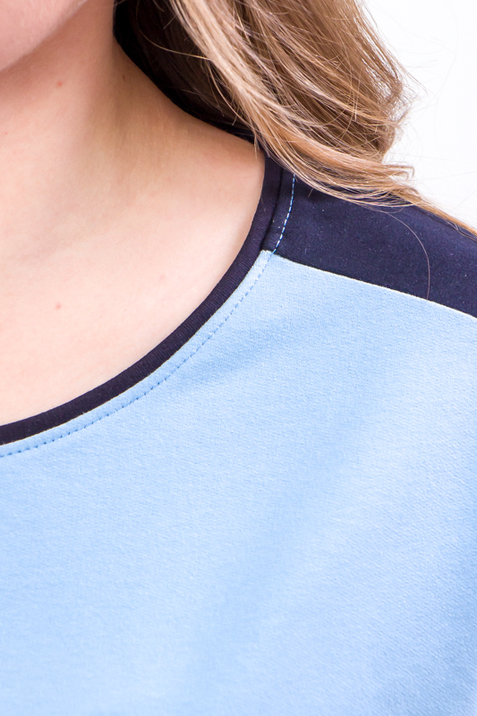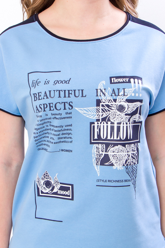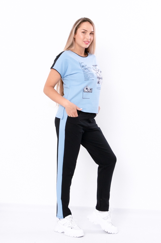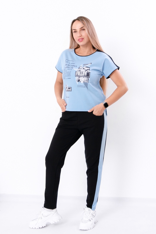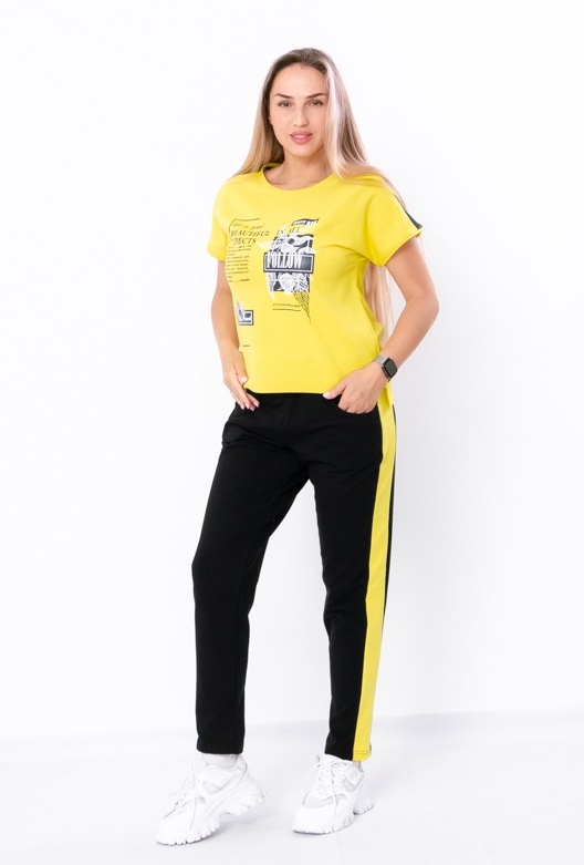 Костюм жіночий пропонується як для прогулянки, так і для спорту. Виконаний з якісного трикотажного полотна середньої щільності. Модель складається з однотонної яскравої футболки, рукав цільнокроєний, прямий. Лінія плеча рівна з контрастним однотонним лампасом і аплікацією як по плечу, так і на поличках футболки. Виріз горловини круглий, злегка поглиблений по переду і в області плечового шва. Прямий силует, низ виробу не рівний - поличка коротше спинки на 10 см, є невеликі розрізи. Штани спортивного крою, прямі, контрастні за кольором. По бічному шву лампас в колір футболки, обробкою є кишені. Пояс притачний на резинці. Сучасна модель дуже зручна, модна і яскрава.