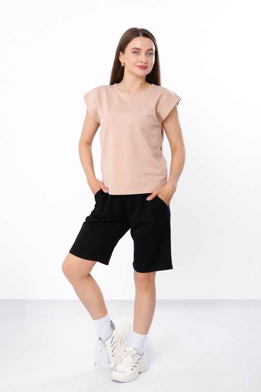 Футболка вільного крою виконана з легкого, дихаючого трикотажу, що приємно лягає на тіло та не сковує рухів. Класична довжина та короткі рукави роблять модель універсальною — вона гарно поєднується не лише із шортами з комплекту, а й з іншими елементами гардероба: джинсами, спідницями, лосинами. Завдяки вільному силуету футболка підходить для різних типів фігури, додаючи образу невимушеності та жіночності.