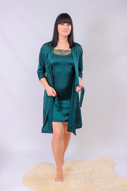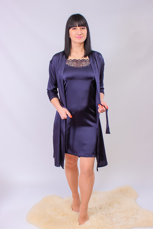 ТМ «Трикотажний рай» пропонує Вашій увазі жіночий комплект, що складається з двох предметів: сорочки на бретелях і халата. Виріб виконаний з м'якої, приємної до тіла тканини - шовк армані, це витончена тканина з напівматової, злегка мерехтливою поверхнею, дуже тонка, ніжна, струмлива. Особливий шарм виробу надає широка мереживна вставка по лінії декольте.