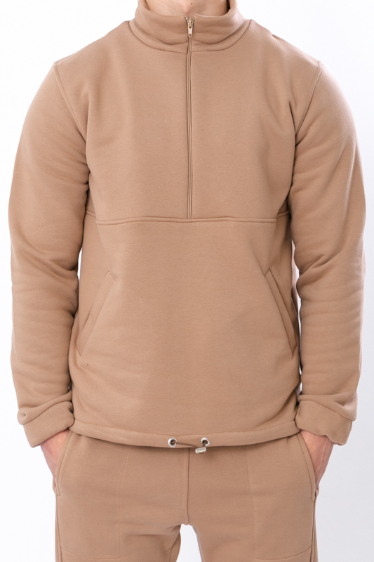 Полотно: трьохнитка петля з начосом (щільне трикотажне полотно, яке складається з трьох шарів ниток. З виворітної сторони тканина має начісування, що робить її надзвичайно теплою і комфортною для прохолодної погоди. З лицьового боку трьохнитка зазвичай має гладку поверхню, а з виворітного — петлі або начіс, що забезпечують теплоізоляційні властивості.)