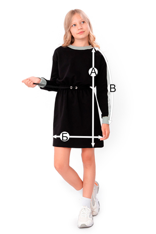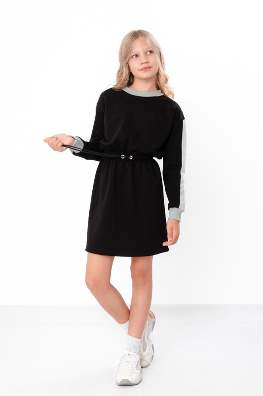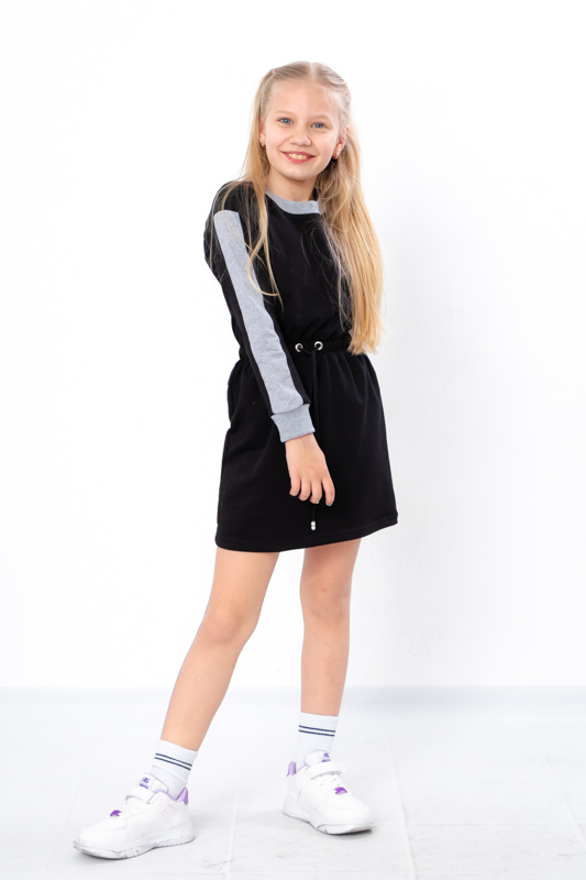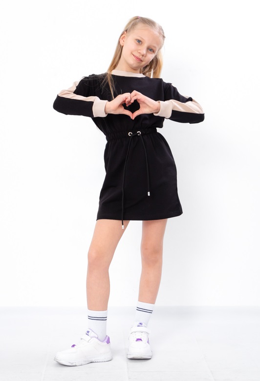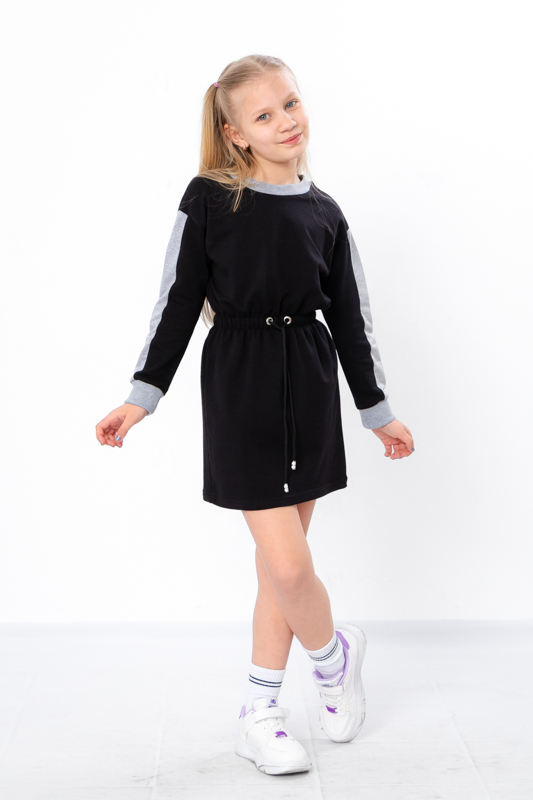 Сукня для дівчинки пошита з однотонної двонитки. Модель з довгими рукавами та округлою горловиною, довжиною до коліна. Пояс на кулісці зі шнурком, що дає можливість регулювати ступінь затягування на талії. Вставки на рукавах іншого кольору, а також манжети та горловина додають сукні оригінальності. Така сукня чудово підійде для шкільних заходів або повсякденного носіння. Полотно гарної якості. Тому, при правильному догляді, сукню можна буде носити не один сезон. Може давати усадку після прання.