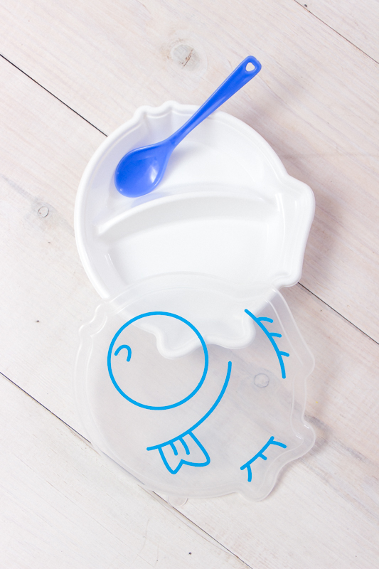 У наборі: двосекційна тарілка з кришкою у формі тварини і ложка.