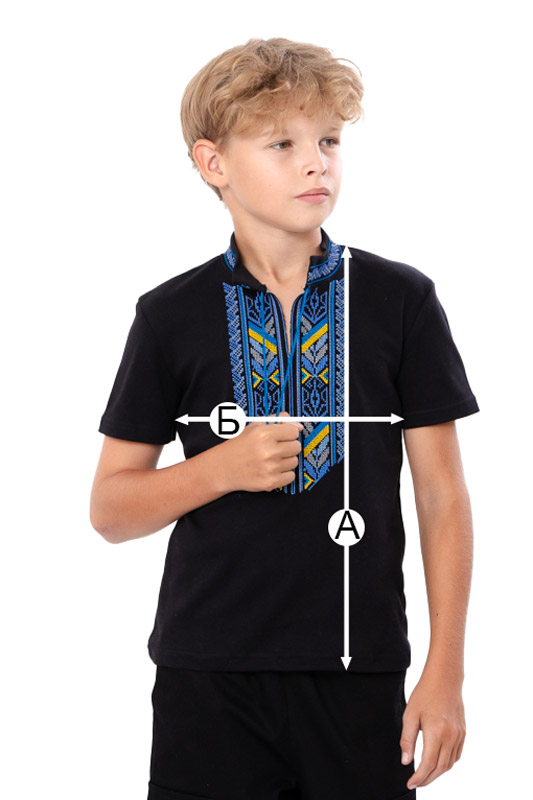 Вишиванка для хлопчиків з коротким рукавом, пошита з натурального трикотажного полотна - інтерлок. Дана модель прямого крою, має комір-стійку, перед вишиванки прикрашений вишитим орнаментом, доповнено китицями-зав'язками під колір вишивки. Виріб добре виглядає з брюками або джинсами. Ошатна і оригінальна вишиванка стане в нагоді на всі випадки життя.