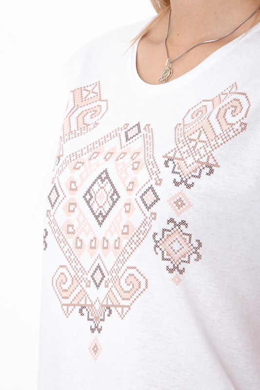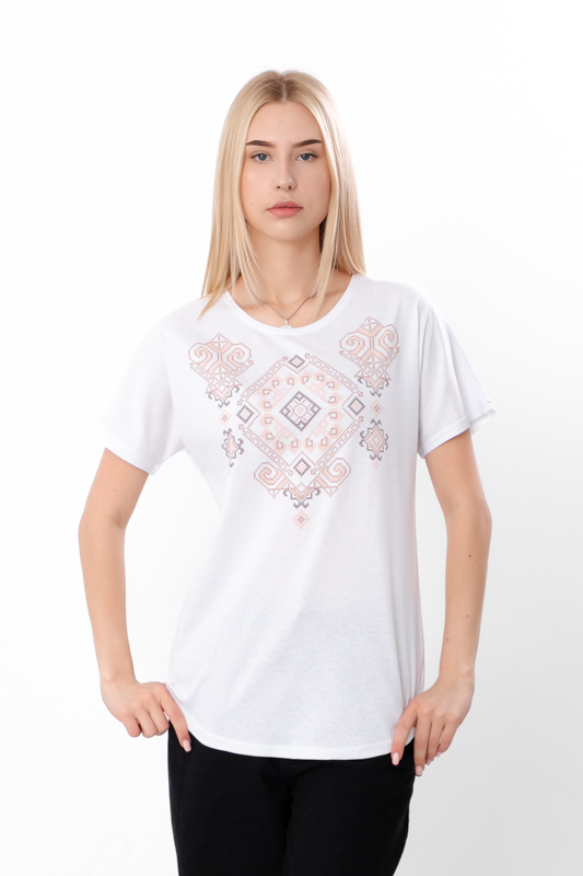 Жіноча футболка з орнаментом із куліру — це поєднання зручності, стилю та української традиційної символіки в сучасному виконанні. Виготовлена з натурального однотонного куліру, ця модель є ідеальним вибором для повсякденного носіння в теплу пору року. Кулір — це легке, дихаюче трикотажне полотно з гладкою поверхнею, яке добре вбирає вологу, не парить і приємно прилягає до тіла.