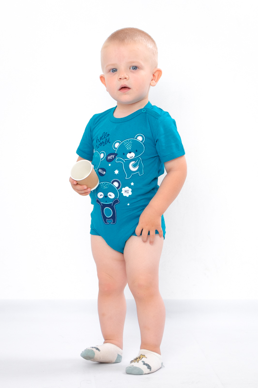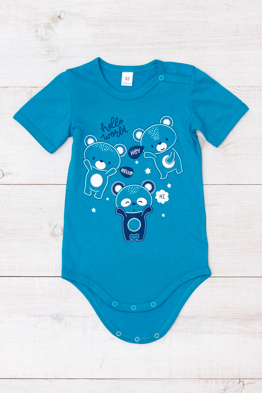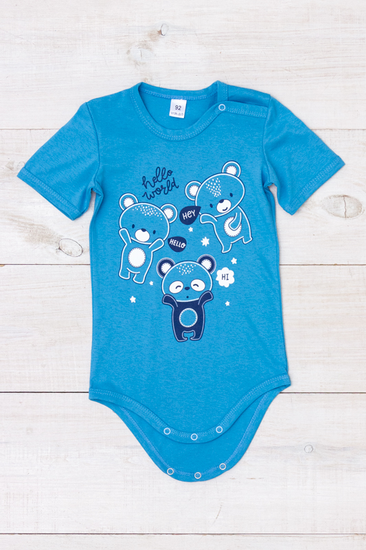 Боді для хлопчика з однотонного куліру. Боді має короткі рукавчики. Для зручності вдягання на плечі, а також по низу є застібки на кнопки. Спереду має накатний малюнок. Кулір – легкий, натуральний за складом матеріал - ідеальний варіант для ніжної шкіри малюка в спекотну погоду. Гарний варіант для щоденного використання.