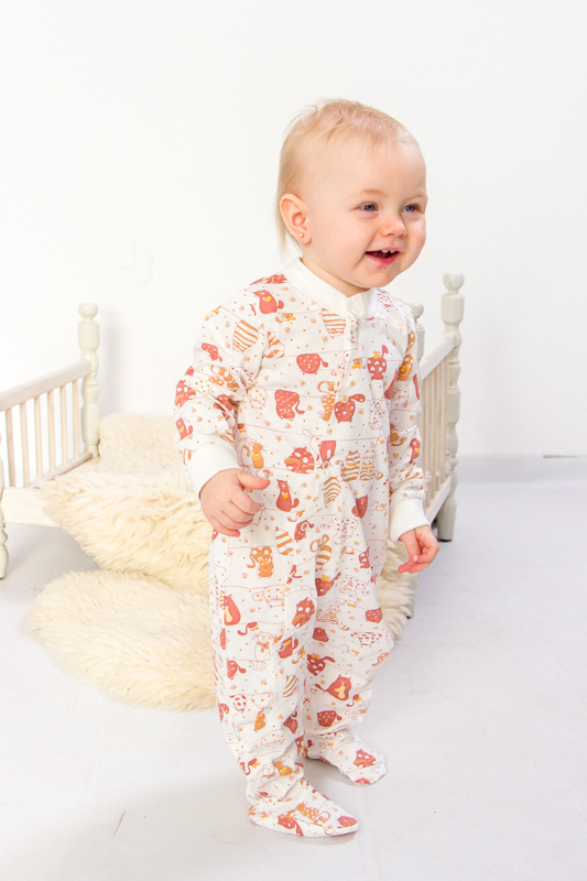 Практичний, зручний ясельний комбінезон з довгим рукавом з набивного куліру. По всій довжині застібається на кнопки. Модель з закритими ніжками і відкритими ручками. Горловина і манжети можуть бути оброблені рубчиком або стрейчем. На окрему увагу заслуговує принт комбінезону - дуже яскравий і барвистий. Модель призначена для носіння на свіжому повітрі в літню пору. Якість матеріалів бездоганна, бавовна відрізняється своїми натуральністю, приємлимістью для шкіри і хорошою стійкістю до зносу. Догляд: прання при температурі 30 градусів, без попереднього замочування. Вироби з принтом перед пранням необхідно вивернути на виворітний бік, барабанна сушка заборонена; прасувати при t не більше 110С; з вивороту; при пранні не змішувати з іншими типами тканин.